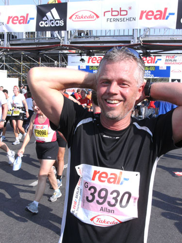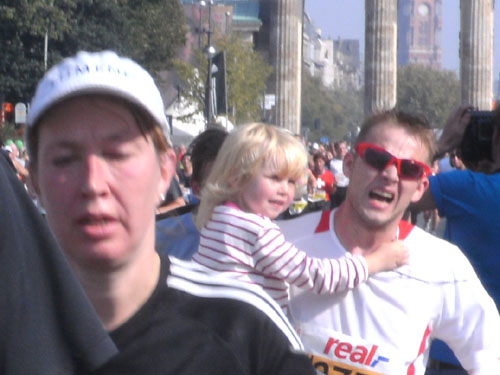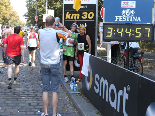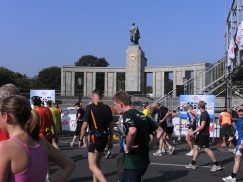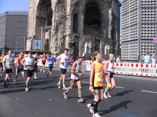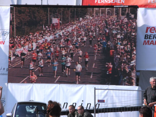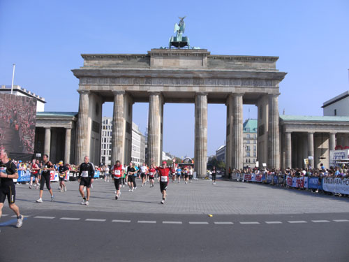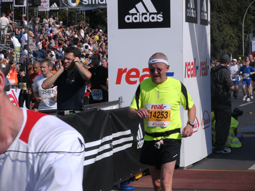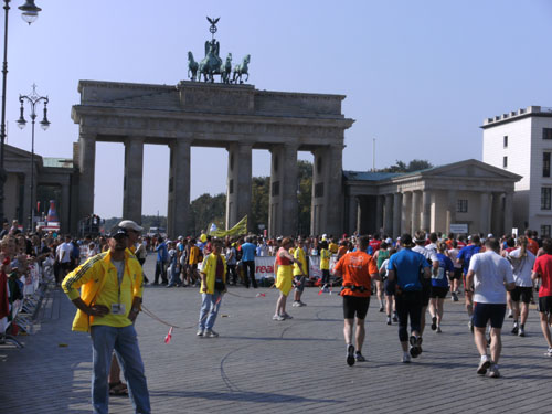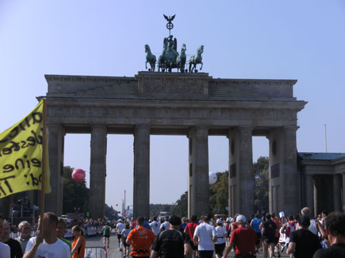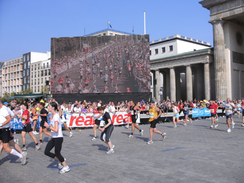 Unter den Anfeuerungen der Zuschauer laufen wir vorbei am Hotel Adlon durch das Brandenburger Tor. Hier wollte ich unbedingt einmal beim Marathon durchlaufen. Als ich es nun wirklich mache, denke ich gar nicht daran. Ich bleibe vor und nach dem Tor stehen und mache zur Belustigung der Zuschauer Fotos. Direkt hinter dem Tor und unmittelbar vor der Ziellinie sind große Videoleinwände und Tribünen für 6.000 Zuschauer aufgebaut. Die Läufer können sich selbst beim Laufen sehen. Ich mache so noch direkt vor der Ziellinie ein Foto von mir selbst.