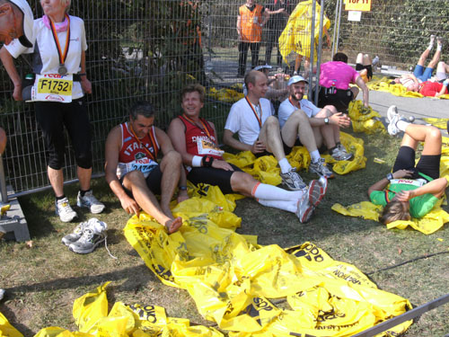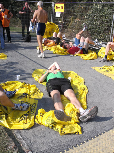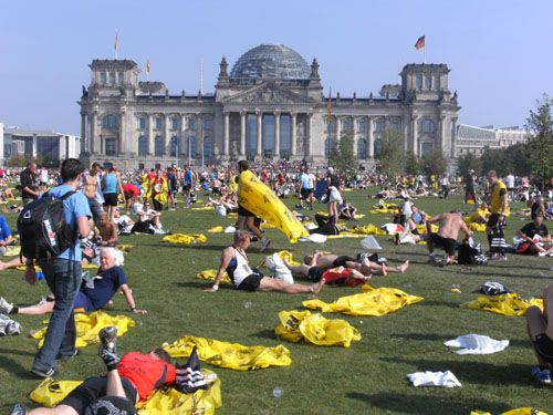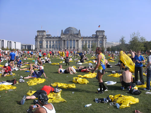 Vor der großen Wiese vor dem Reichstag liegen unzählige Läufer mit und ohne Wärmefolien und freuen sich über den schönen Lauf.