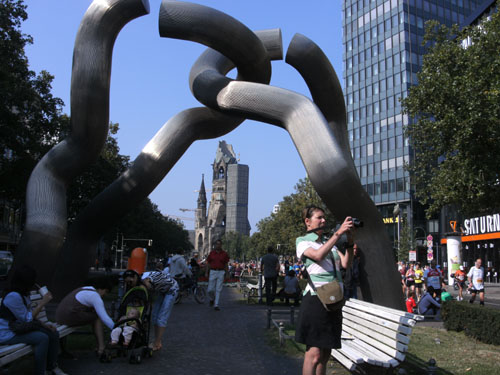 Aus der Ferne grüßt die Kaiser-Wilhelm-Gedächtniskirche und das Europa-Center. Es folgt rechter Hand das KaDeWe, Kaufhaus des Westens. Der Begriff stammt jedoch aus der Zeit weit vor dem Zweiten Weltkrieg und hat nichts mit der früheren Teilung der Stadt Berlin in Ost- und Westberlin zu tun.