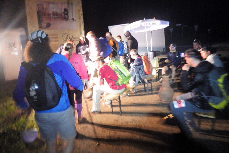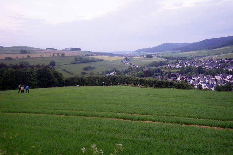 Ab dem „Kahlen Asten“ befindet man sich auf dem „Rothaarsteig“.Immer wieder durchläuft man dichte Waldgebiete und plötzlich wieder offene Waldstücke, meist auf Anhöhen, die einen in den frühen Morgenstunden atemberaubende und unvergessliche Ausblicke auf das wolkenverhangene Sauerland mit seinen „1000 Bergen“ bieten. Ungewollt hat der Orkan Kyrill viele Aussichtsplattformen hinterlassen. Wir kommen zum Verpflegungspunkt „Lenneplätze“. Apropos: Die Verpflegung ist an allen Ständen hervorragend, vom Griebenschmalzbrot bis hin zum tollen Malzbier bleiben fast keine Wünsche unerfüllt. Es gibt aber auch Kaffee (in der kühlen Nacht sehr angenehm) und ganz viel selbstgebackenen Kuchen. An allen Verpflegungsstellen brennen auch wärmende Feuer. Langsam geht auch der Mond auf und das besonders schön, weil blutrot.