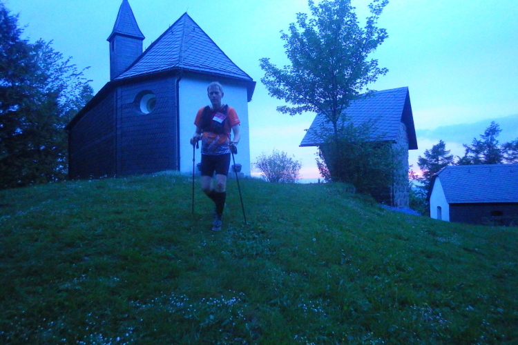 6,5 km und 340 Höhenmeter geht’s jetzt Richtung „Hunau“, mit 818 m ü NN die zweithöchste Erhebung auf der Strecke. Gleich am Anfang werden wir mit einem sehr harten, neu eingebauten Streckenteil überrascht. Es geht direkt recht steil den Kreuzweg hinauf zur Kapelle. Dort mache ich dann kurz Rast, um mir wegen der hereinbrechenden Nacht die Stirnlampe und eine Weste anzuziehen. Dann weiter, denn die Hunau ist noch nicht erreicht. Es ist gut, dass ich die Strecke kenne. Aber Nachts sind halt nicht nur alle Katzen grau, sondern eben auch die ganze Natur.