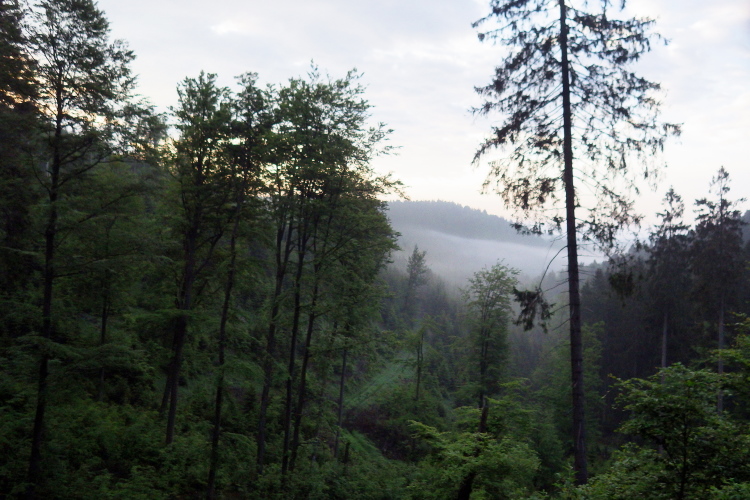 Dann fällt pünktlich um 19:00 Uhr der Startschuss. Von 470 m NN geht es leicht ansteigend südwärts über die Hunaustrasse Richtung Wald. Nach gut 1,5 km biegt man in das „Walkenmühltal“ ein. Es geht am Wildgehege mit Hochlandrindern vorbei. Hier kommt der erste größere Anstieg zum Hollenhaus, einem steil abfallenden Felsen mit Höhlen, in denen die „Hollen“ der Legende nach hausten. Es ist ein Felsen, ganz mit gelb-grünlichem Flechtenbewuchs überzogen. Leider wird der Ort von fast allen Teilnehmern übersehen, obwohl er direkt an der Strecke liegt. Aber dafür schreibe ich ja auch den Bericht, um die Augen für die Sehenswürdigkeiten an der Strecke zu öffnen.