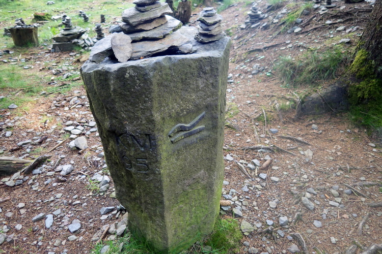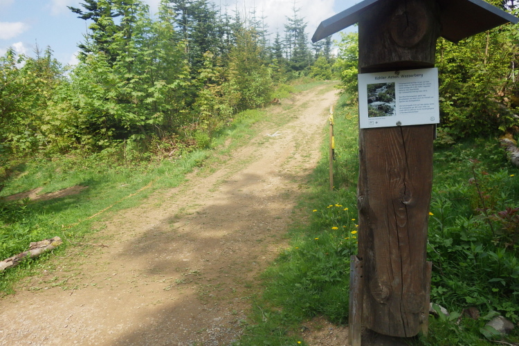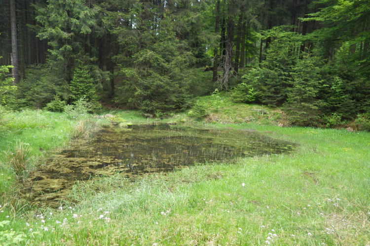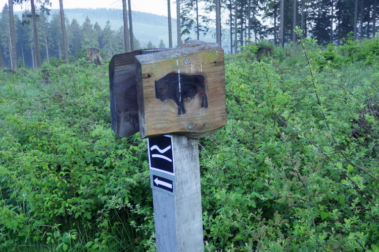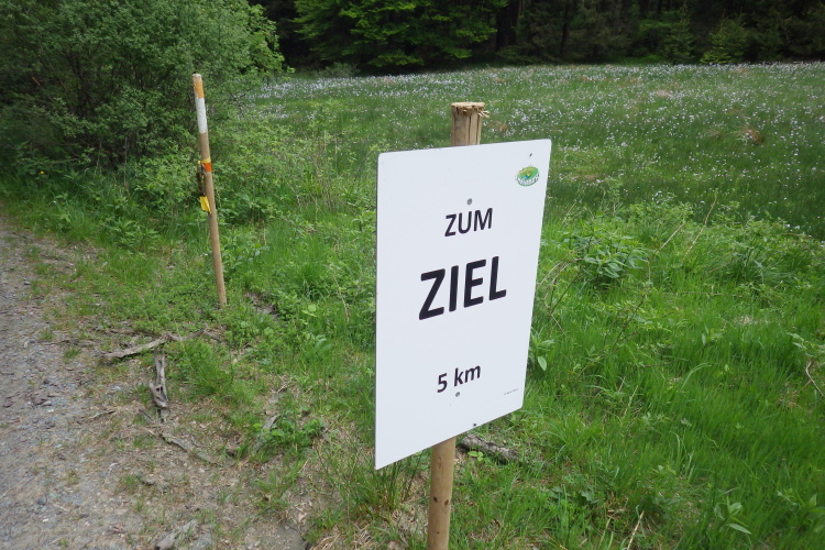 Weiter geht’s zum zweiten VP2 auf der „Nasse Wiese“, einem ca. 8000 Jahre alten Hochmoor, das auf ca. 750 m liegt. Hier findet man kleine verträumte Bachläufe mit blühenden Wasserpflanzen und die letzten Narzissen. Ein klares Zeichen dafür, dass hier der Frühling noch schwer zu kämpfen hat. Noch ca. 1,5 km bergan und der Scheitelpunkt ist erreicht. Nur 200 m weiter rechts findet man das berühmte „Hundegrab“. Hier liegt die Schweisshündin Isolde von Hunau begraben. Also schwitzen nicht nur Läufer und Marschierer, sondern auch die Hunde? Ja, aber Hunde schwitzen anders als Menschen. Schweiß bedeutet in der Jägersprache Blut.