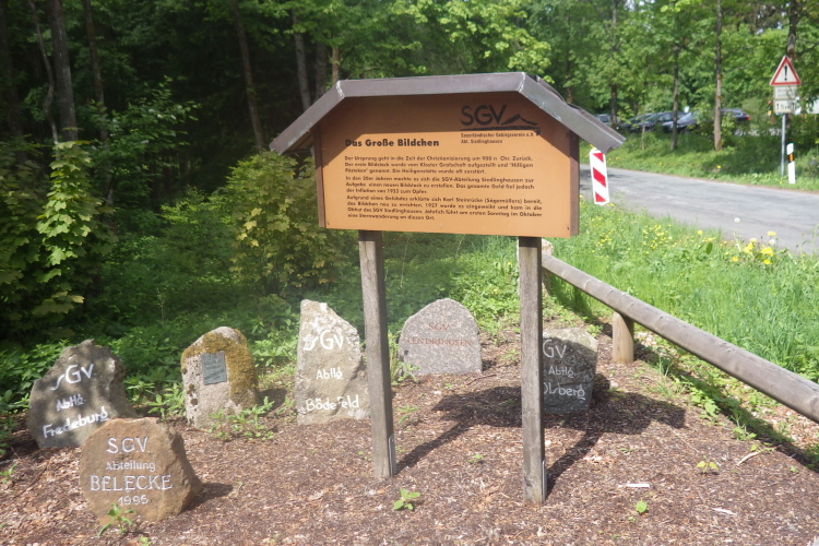 Hier findet man dann auch den etwas schwer auszumachenden „Hunaustein“, der die 818 m Höhe angibt. Zu sehen ist das Grab aber erst auf dem Rückweg, da es nun mittlerweile stockfinster ist. Doch zurück zur Strecke, denn an der „Feuerstätte“ (798m NN) führt sie bergab über den „Klappersberg“ (730 m NN) zum „Großen Bildchen“, ein Bildstock von der SGV-Abteilung Siedlinghausen. Hier haben mehrere SGV-Abteilungen aus der Umgebung neben den Bildstock ihren eigenen Gedenkstein aufgestellt. Ca. 23 km sind geschafft, aber noch nicht der höchsten Punkt der Strecke. Noch 140 Höhenmeter zum 841 m hohen „Kahlen Asten“ mit dem Astenturm. Doch bevor wir oben sind, ist die Skipiste zu überwinden, und das nicht im lockeren Hüftschwung, sondern „einfach“ im Direktanstieg. Unten stehen noch die Raupenfahrzeuge, man hat das Gefühl, die Wintersaison ist gerade erst zu Ende. Oben angekommen, sieht man links den beleuchteten Astenturm liegen, Dann geht es wieder steil bergab..