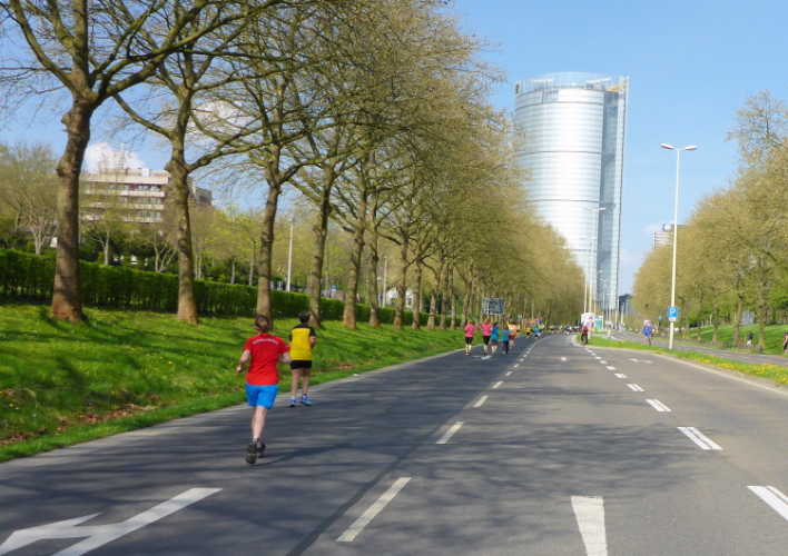 Ich weine auch fast, weil ich jetzt richtig flott die Brücke hinauflaufe. Es stimmt alles! Die zweite Runde ist noch besser als die erste. Aber beim Akademischen Turnverein, bei km 32, muss ich mich bremsen. Irgendwie kann ich mein Tempo nicht glauben. Michael Irrgang, der Chef der Deutschen Ultramarathon Vereinigung, heute Pacemaker für 4:30 zieht vorbei, verschwindet nach drei Minuten im Grün der Rheinaue, bevor ich die Verfolgung aufnehme. Und dann passiert etwas, was mich sehr bewegt: Vor dem World Conference Center überholt mich ein ungefähr 10 Jahre junges Mädchen einer Schülerstaffel. Sie hat sichtliche Probleme. Ihre Freundin, die sie auf dem Fahrrad begleitet, fragt sie: „Brauchst du eine Cocktailtomate?“