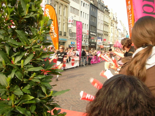 Auf den fünften Verpflegungspunkt freue ich mich besonders. Diesen betreibt die Bundeswehr unter der Leitung von Hauptfeldwebel Knut Kistner. Kaum sind 18 Jahre vergangen, schon werde ich meinen ehemaligen Panzerkommandanten wiedersehen! Leider klappt das nicht, denn keiner weiß wirklich, wo er steht und für eine umfangreiche Suche fehlt dann doch die Zeit, denn ich muß mich sputen, um Eugen wieder einzuholen, der unterdessen auftragsgemäß weiterlaufen ist. Bei km 20 wieder am Koblenzer Tor biegen wir links in den Hofgarten ein, nutzen die sechste und letzte Verpflegungsstelle, überqueren die Bonngasse, grüßen das Beethovenhaus sowie die zahlreichen Zuschauer und sind nach einigen hundert Metern auf unangenehmem Kopfsteinpflaster schon auf der zweiten Runde. Auf unser Ziel, unter vier Stunden zu bleiben, haben wir mittlerweile rund drei Minuten herausgelaufen und den Tempomacher zwischendurch dann doch vorsichtig überholt.