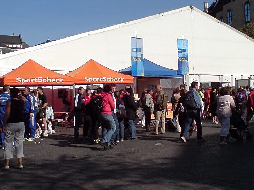 Das Zelt, in dem auch die Marathonmesse stattfindet, ist mit den bunten Waren der Aussteller gut gefüllt. Den größten Stand mit über 200m² hat dabei der Mit-Sponsor Sport-Scheck eingerichtet.