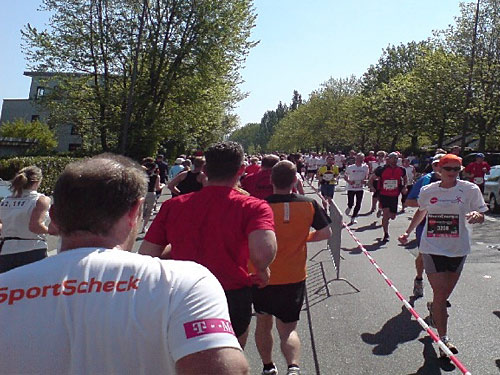 Natürlich sind auch die Mitarbeiter des rosaroten Riesen auf der Laufstrecke. Alleine T-Mobile bringt über 150 Läuferinnen und Läufer über die Ziellinie. Wobei mir gerade auffällt, dass ich dieses Mal nur wenige Starter der BSG „Germanwings“ in ihren auffälligen Trikots gesehen habe. Gewöhnlich sind die darin steckenden Starterinnen nicht nur sportlich, sondern auch optisch eine echte Augenweide und auf den Laufveranstaltungen rund um Köln/Bonn gerne gesehene Gäste.