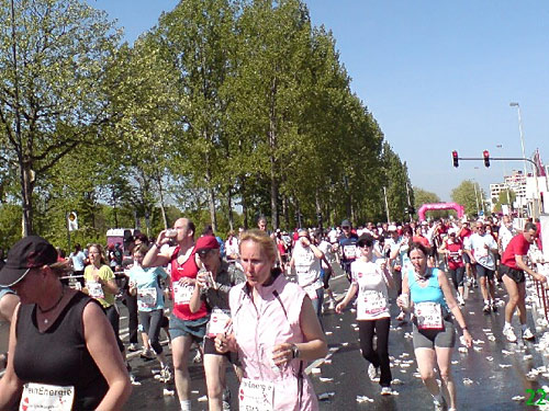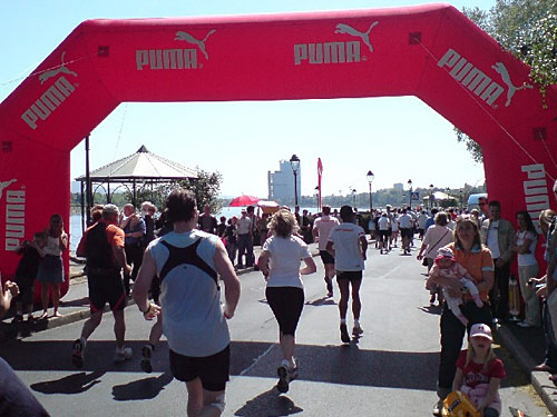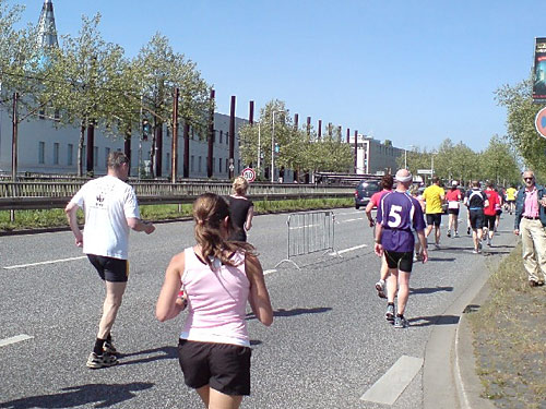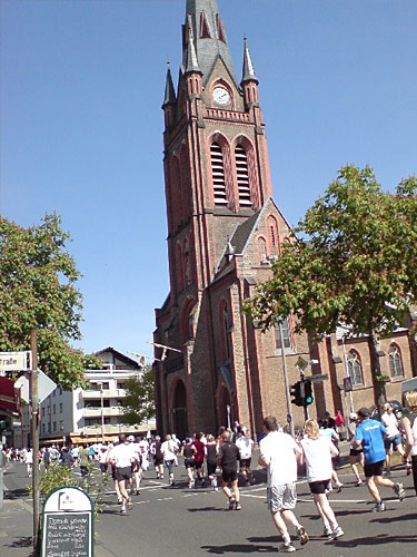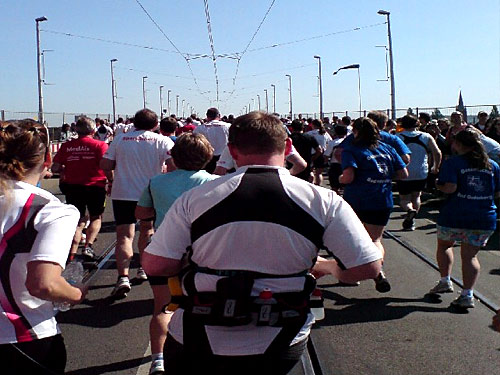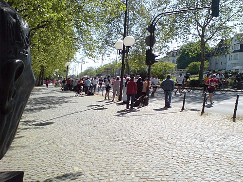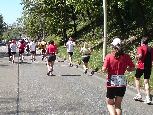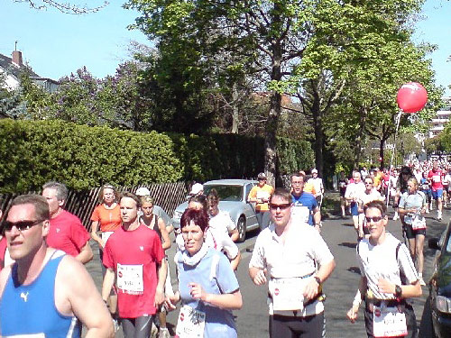 Nachdem wir unter lautstarken Anfeuerungsrufen des Moderators und lautem Applaus der Zuschauer die Startlinie überquert haben, kommt schon die erste kleine Herausforderung auf uns zu, als wir über die Kennedy-Brücke über den Rhein hinweg in den Stadtteil Beuel wechseln. Dort, am Ende der Brücke, bekommen wir gezeigt, wo in Beuel der Hammer hängt – eine Samba-Gruppe spielt sich die Seele aus dem Leib und läßt einen die Anstrengung des Brückenaufstieges direkt vergessen. Auf den folgenden zwei Kilometern geht es etwas ruhiger zu, während wir in ständigem leichten auf und ab durch ein Wohngebiet laufen dessen Bewohner sich wohl schon bei den vor uns passierenden Marathonis verausgabt haben.