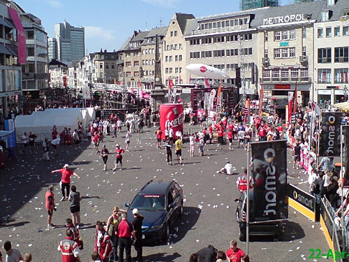Zurück über die Kennedy-Brücke geht es auf die andere Rheinseite. Die hier postierte Samba-Band hat zwar die Straßenseite gewechselt, dabei aber absolut nichts von ihrem Feuer verloren. Davon angesteckt hat sich auf der Brücke eine stimmungsvolle Menschenmenge angesammelt .Mit leichter Gänsehaut laufen wir durch das klatschende und jubilierende Spalier.