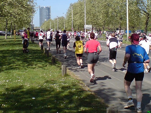 Zu Füßen des Posttowers verlassen wir den Rhein und biegen auf die Petra-Kelly-Allee ein. Jetzt beginnt ein tröger Teil des Laufes – zwei Kilometer hin zum Wendepunkt bei Kilometer 15, zwei Kilometer zurück. Das ganze auf einer abgesperrten vierspurigen Straße. Rechts und links überwiegend grüne Böschungen ohne echte Aussicht verleiten viele Teilnehmer dazu, ihr Tempo zu verlangsamen und der mittlerweile herrschenden Hitze Tribut zu zollen. Martina geht es im Großen und Ganzen noch recht gut. Gemeinsam mit Marianne hat sie als Neuling auf der Halbmarathonstrecke keinen Zweifel daran, dass sie die Distanz auf Anhieb schaffen wird.