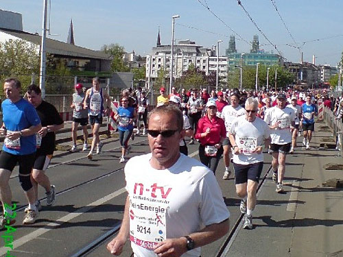 Die beiden Abenteurerinnen haben ihre Unterlagen am Samstag abgeholt. Während es für Martina die erste Teilnahme an einer größeren Laufveranstaltung ist, kann Marianne auf ihre Marathonteilnahmen in Köln 1998 und 1999 zurückblicken. Während sie seinerzeit wenig vom „Vater Rhein“ zu sehen bekam, wird sie während des Laufes hier etliche Kilometer an dessen Ufer verbringen. Das es dabei stromaufwärts gehen wird, ist nicht unbedingt von Nachteil. Mit ein wenig Glück kann man sich dabei ein kleines Wettrennen mit einem gegen den Strom ankämpfenden beladenen Frachtschiff liefern.