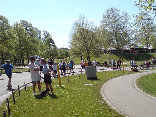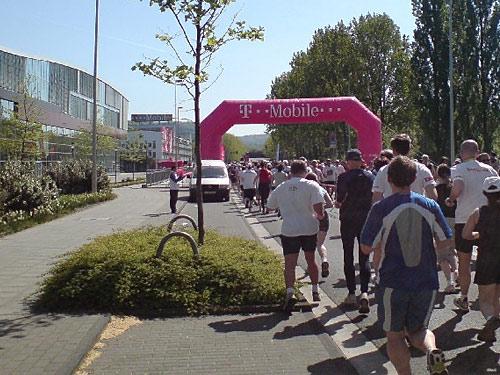 Schon kurz nach dem Beginn der Wendepunktstrecke hinter Kilometer 3 hören wir Musik und die laute Stimme eines Moderators. Erstmals nähern wir uns dem Gebiet des rosaroten Riesen, der hier seine schmucke Tochter T-Mobil in standesgemäßen weitläufigen Räumlichkeiten untergebracht hat. Über 5000 Menschen arbeiten die Woche über in den innenarchitektonisch reizvollen Gebäuden. Bei meinen Besuchen dort fand die Unterbringung der Raucher im Kantinenbereich immer meine besondere Aufmerksamkeit: Ein großer Glaswürfel – einem Aquarium nicht unähnlich – dient als Aufenthaltsort und Pranger zugleich.