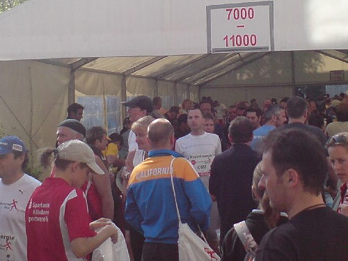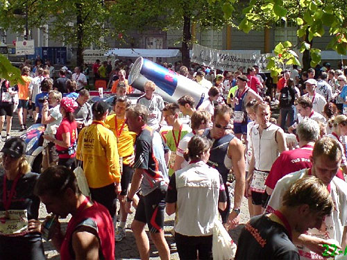 Am Sonntagmorgen reisen wir wieder mit der Bahn an. Das hat sich als praktisch bewährt, da zum einen der Preis für das ÖPNV-Ticket bereits in den Startgebühren enthalten ist und zum anderen die Entfernung zwischen Bahnhof und Startgelände gerade mal 5 Gehminuten beträgt. Wie in den Jahren zuvor haben hunderte von Läufern dieselbe Alternative gewählt und sich damit die elende Parkplatzsuche in der Innenstadt erspart. Gut erkenntlich an den Kleiderbeuteln ziehen wir in langen Schlangen erwartungsvoll in Richtung Rathausgasse um in der dort aufgebauten Zeltstadt unser Gepäck loszuwerden. Die Frage nach der richtigen Laufbekleidung stellt sich heute nicht wirklich. Heiß soll es werden, von bis zu 26 C° spricht die Wettervorhersage.