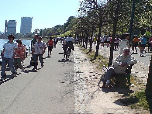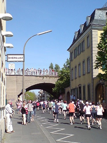 In einer langen Schleife verlassen wir die Brücke und laufen hinunter zum Rhein, der die nächsten 3 Kilometer unser Begleiter sein wird. Zuvor kommen uns auf der Welschnonnenstraße noch die Marathonläufer entgegen, die von hier aus nur noch wenige Meter bis zum Ziel haben. Viele sind von den Strapazen der letzten Stunden in der sommerlichen Hitze arg gezeichnet.