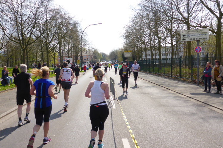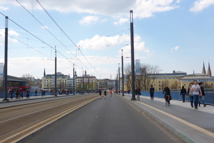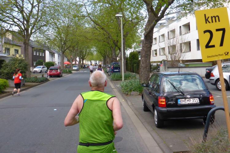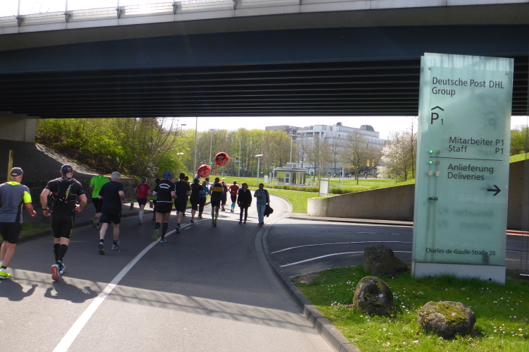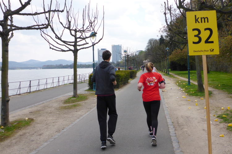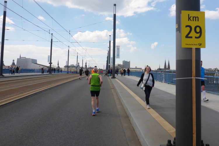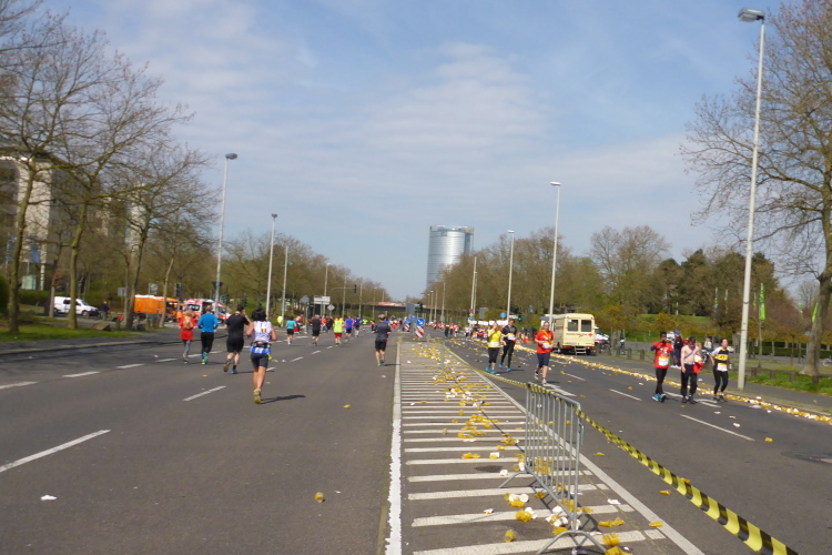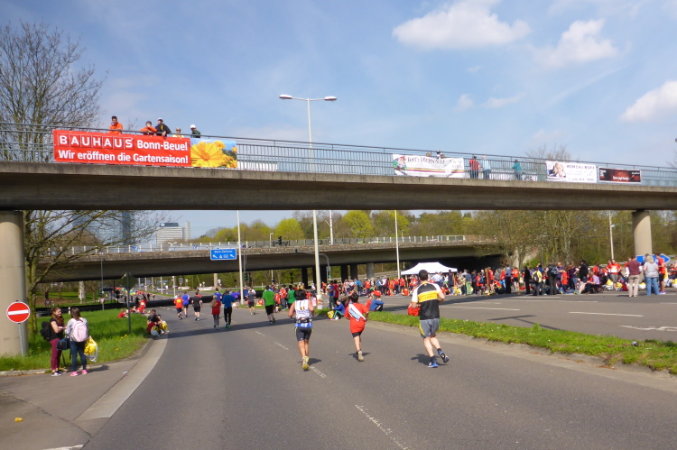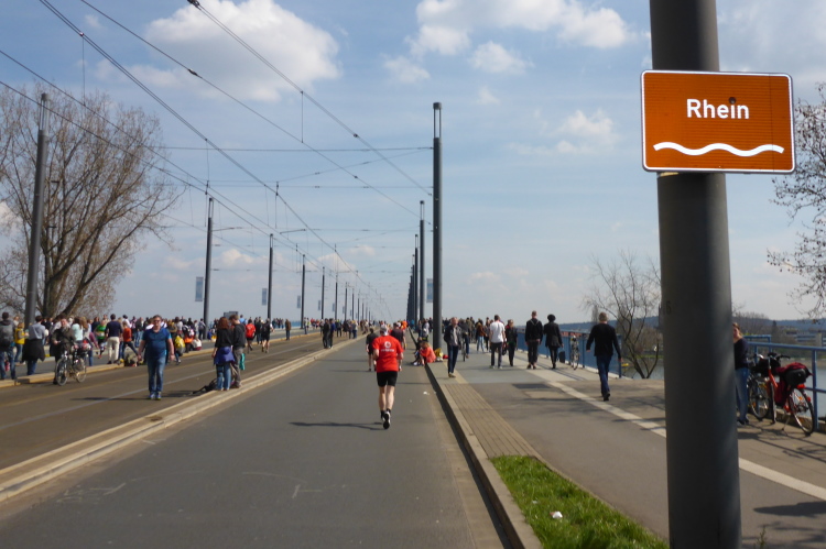 Mit dem „Anstieg“ zur Kennedybrücke beginnt die zweite Runde. „Joe, du musst auch mal schreiben, wieviel Höhenmeter die Strecke des Bonn Marathons hat!“ Also: die zweite Runde, ist absolut identisch mit der ersten, hat aber bedeutend mehr Höhenmeter. Ich lasse mich deswegen zurückfallen, um Kräfte zu sparen.