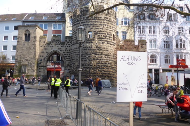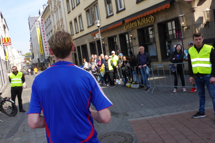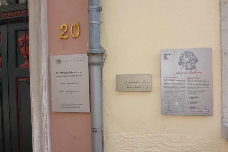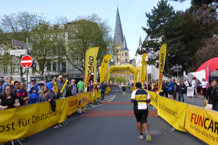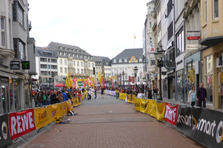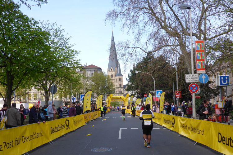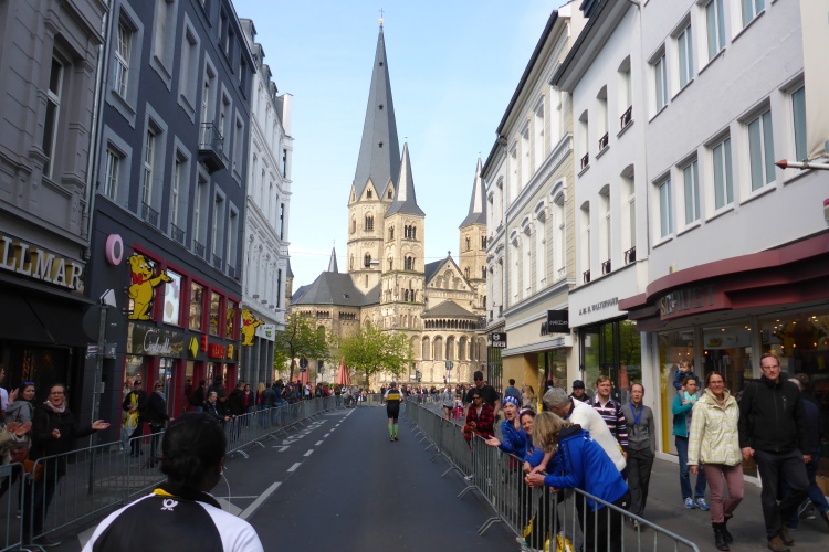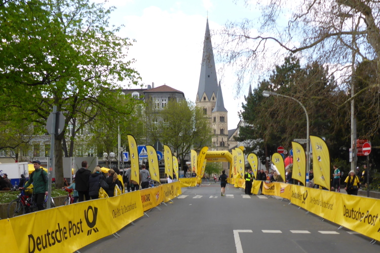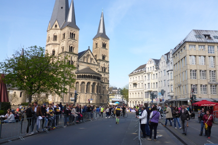 Rechts in der Sternstrasse wäre jetzt der Zieleinlauf. Wir laufen geradeaus, und na klar, links ist das Beethovenhaus. Mein 10 Meter-Abstecher für ein Foto des Geburtshauses des großen Meisters lässt Zuschauer, Security und Läufer aufschreien. Ich werde regelrecht eingekreist und dann auf den rechten Weg geführt. Mit offenen Mündern bleiben japanische Touristen stehen, als sei gerade der Mann mit dem Hut verhaftet worden.