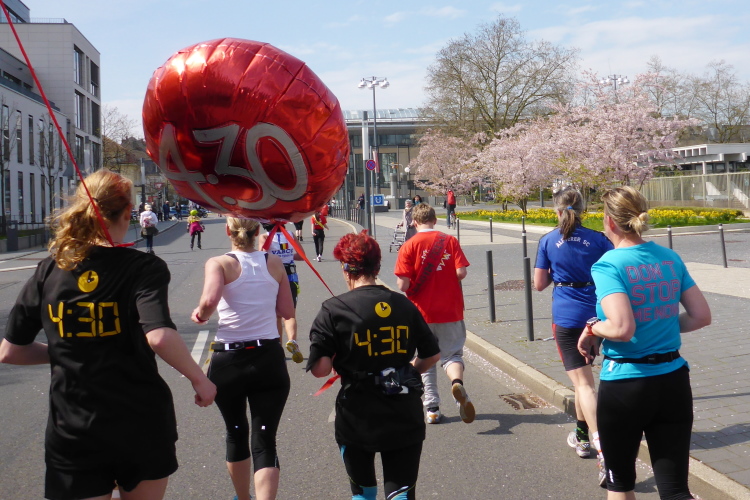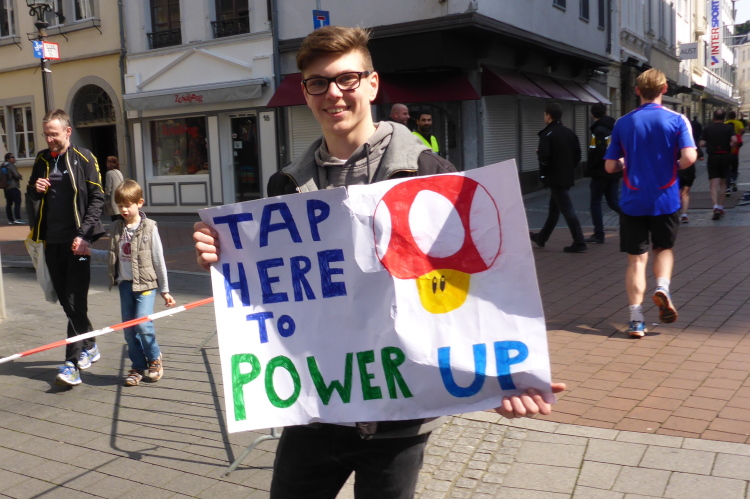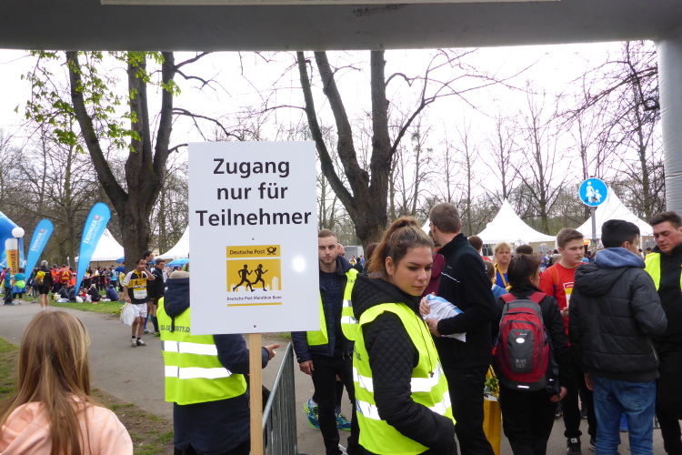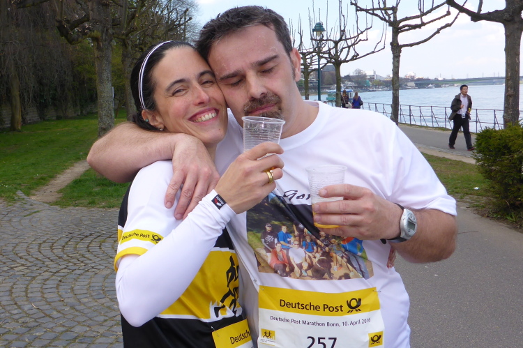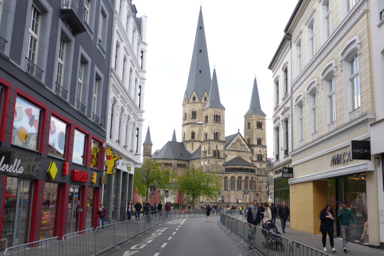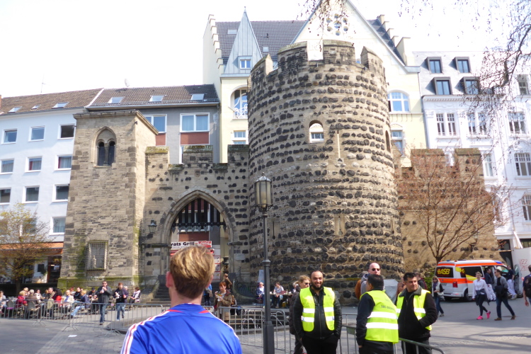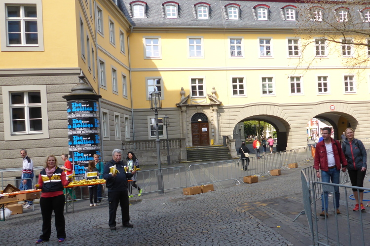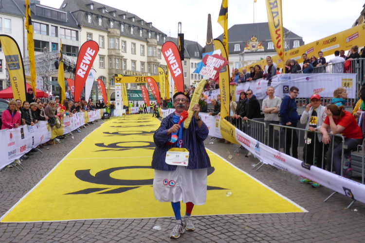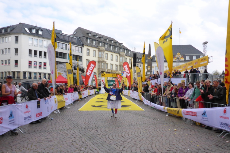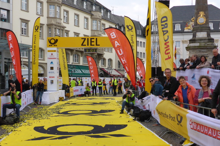 Rechts in der Sternstrasse wäre jetzt der Zieleinlauf. Wir laufen geradeaus, und na klar, links ist das Beethovenhaus. Mein 10 Meter-Abstecher für ein Foto des Geburtshauses des großen Meisters lässt Zuschauer, Security und Läufer aufschreien. Ich werde regelrecht eingekreist und dann auf den rechten Weg geführt. Mit offenen Mündern bleiben japanische Touristen stehen, als sei gerade der Mann mit dem Hut verhaftet worden.
