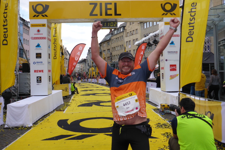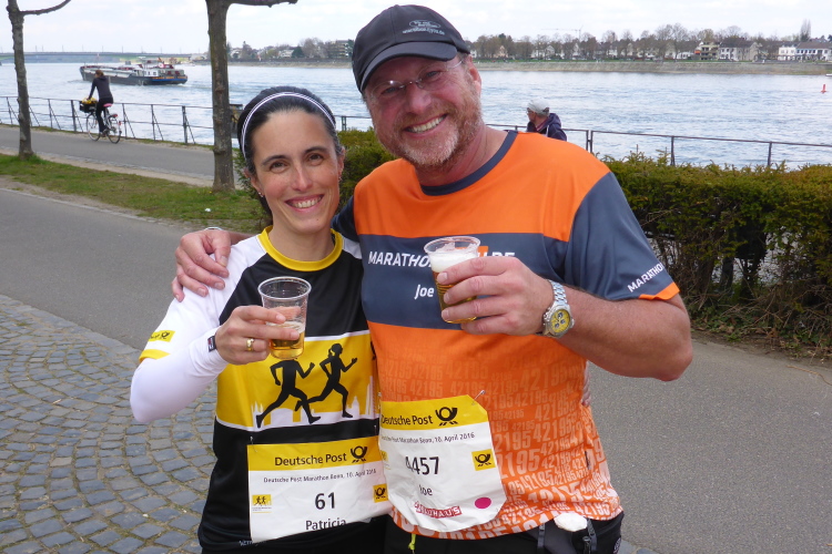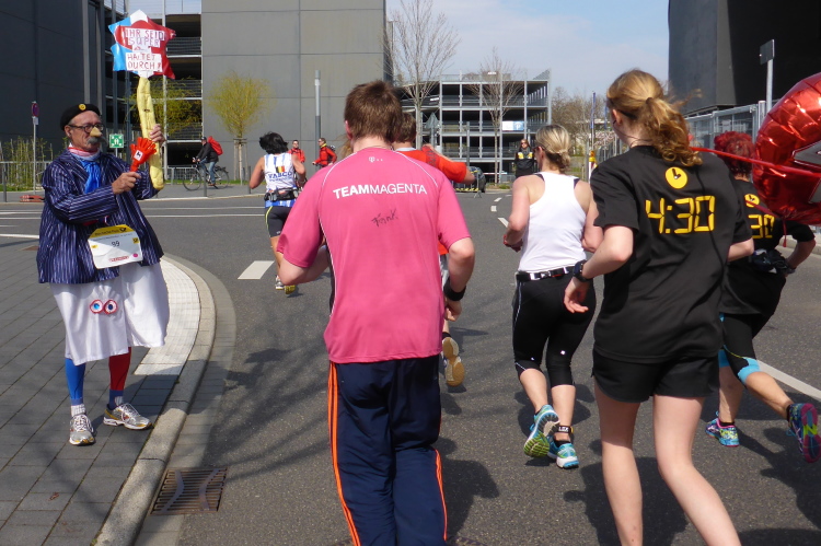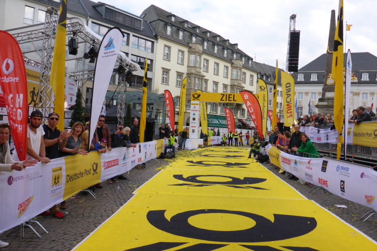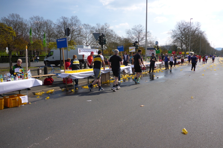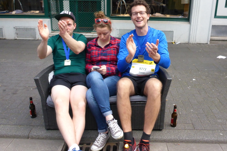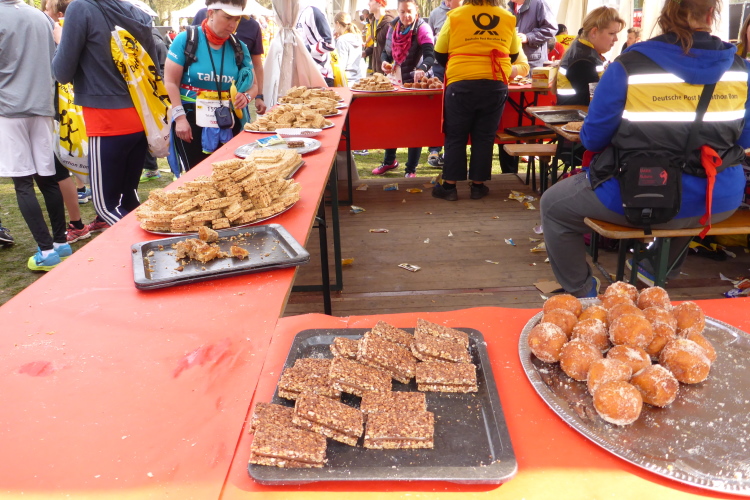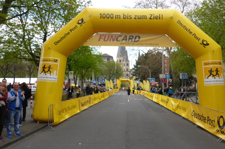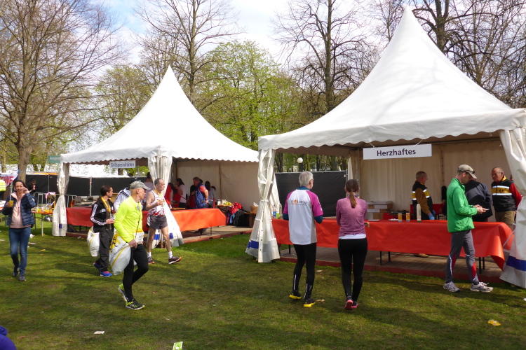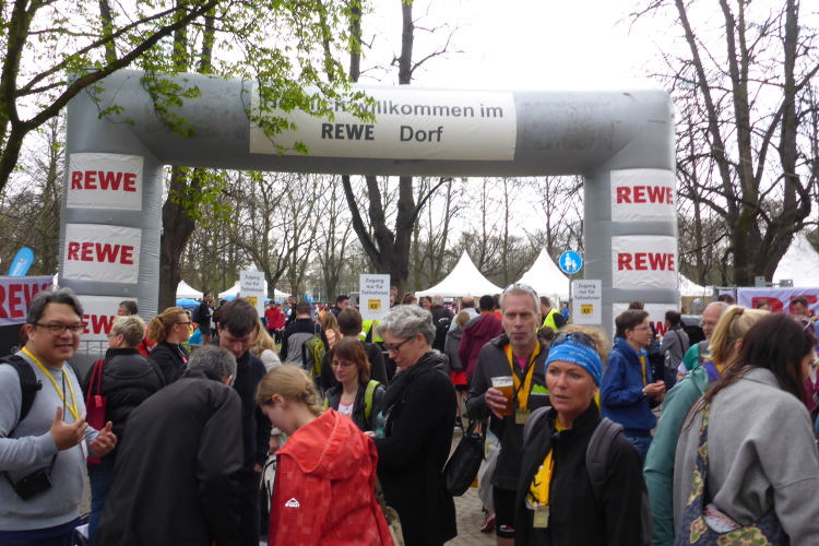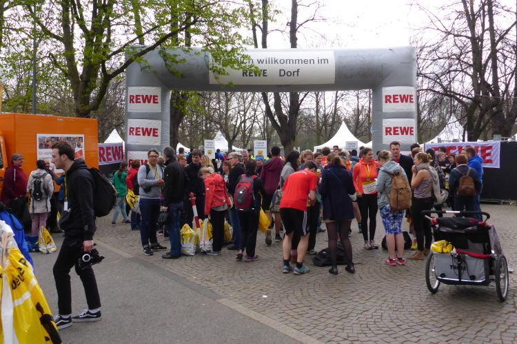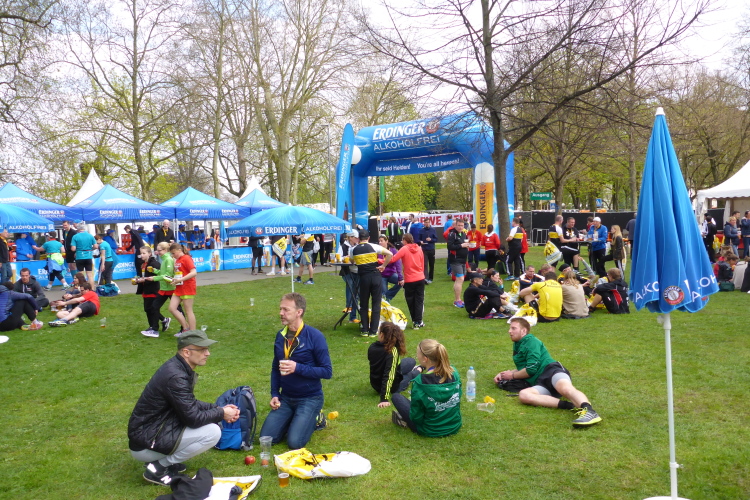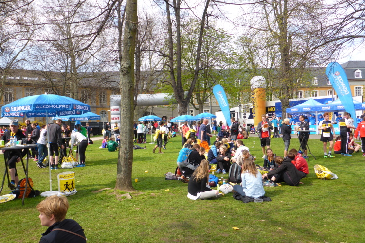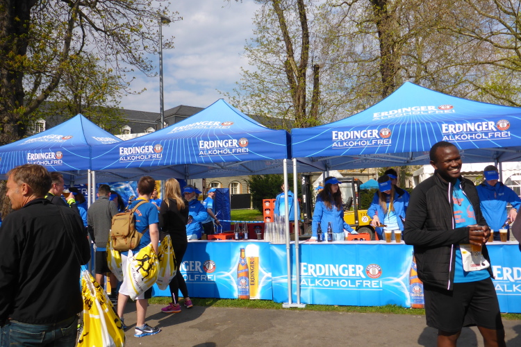 Der Zieleinlauf ist klasse. Vor mir Michèl, rechts die Tribüne, überall Cheerleader mit Glitzerzeug. Nagut, bin ein wenig spät dran. Das merke ich dann auch im Rewe-Dorf. Über 13600 Läufer haben vor mir die Marathonfrikadellen vertilgt. In der Ergebnisliste stehe ich auf Platz 715. Darauf dann mal ein Erdinger Alkoholfrei!