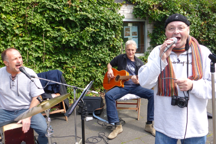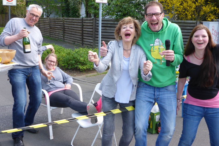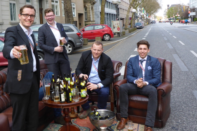 Wir befinden uns auf der Diplomatenrennbahn, wie die Strasse zur Bonner Regierungszeit hieß. Kurz hinter dem Auswärtigen Amt, was immer noch so heißt, sitzen die Burschen der Rhenania Xy mit Ledersesseln und Eiskübel auf der Fahrbahn. Die 4:30 Luftballons und damit Conny und Katharina verschwinden nun logischerweise endgültig aus meinem Sichtfeld.