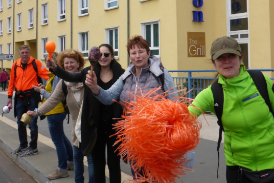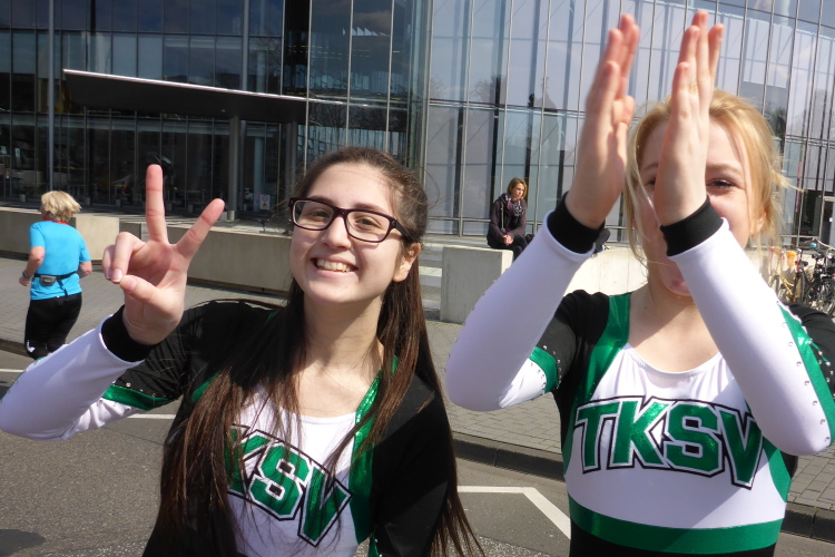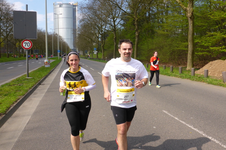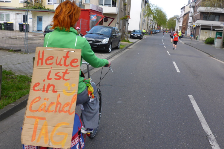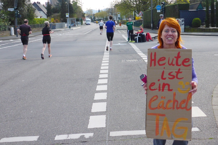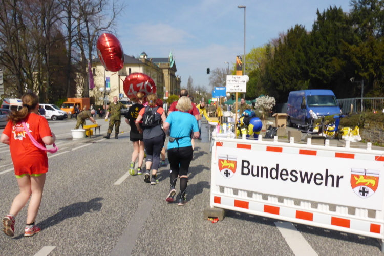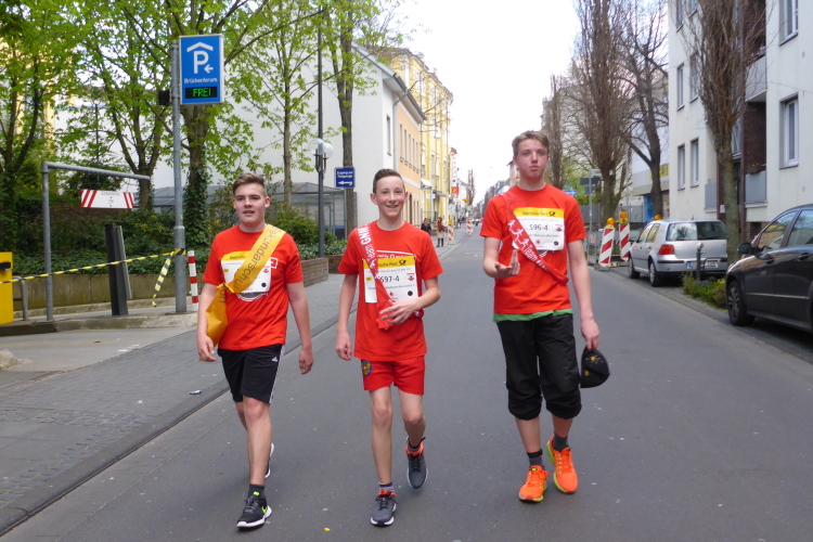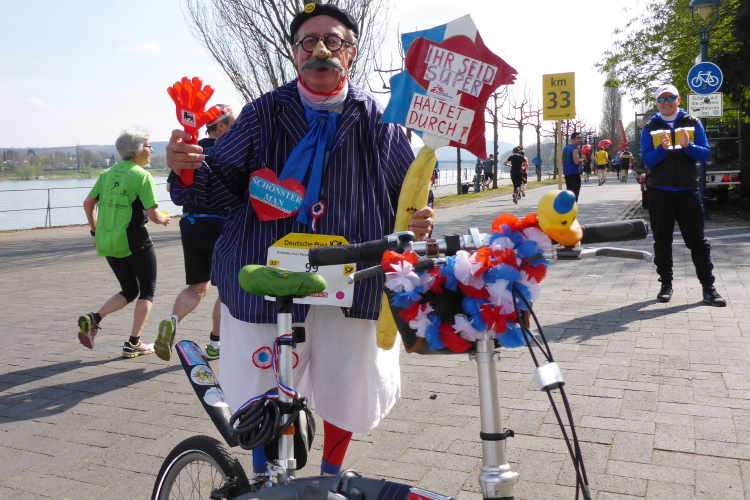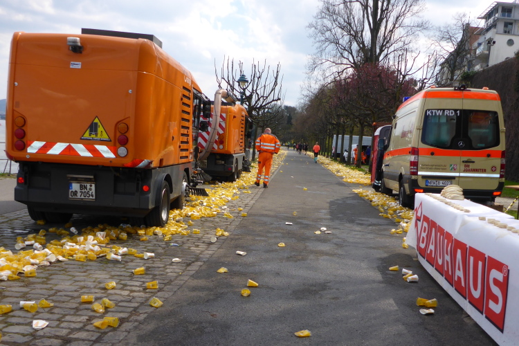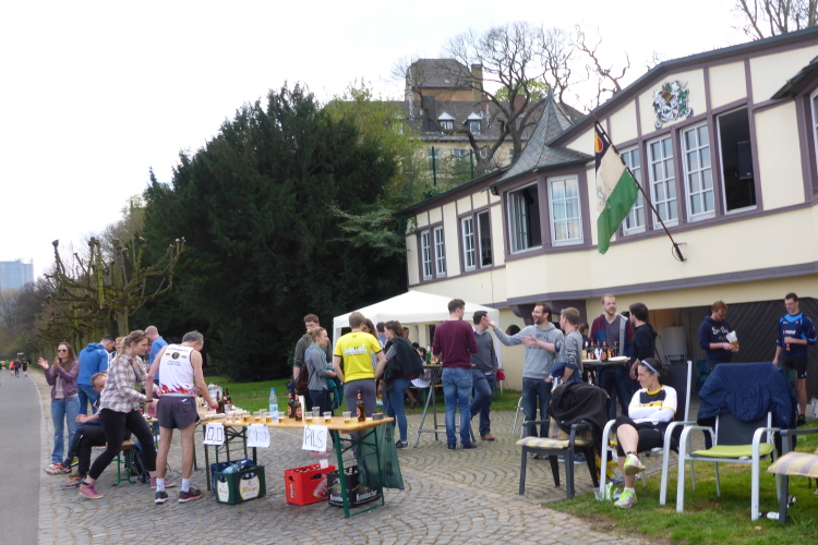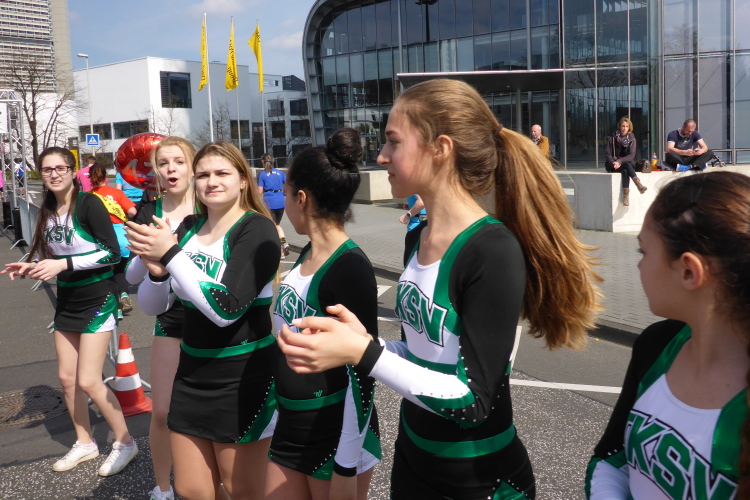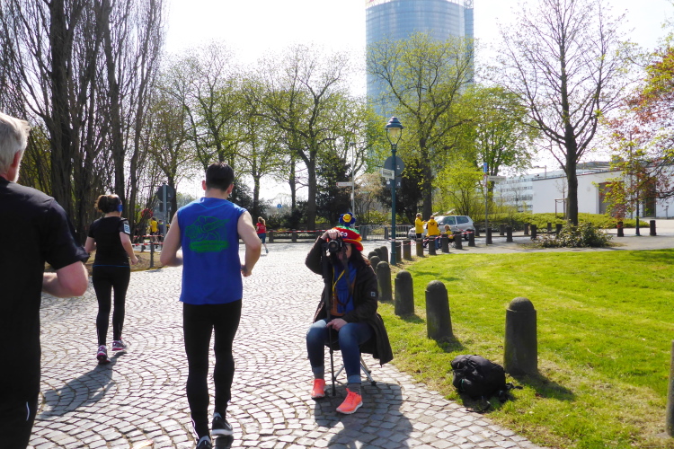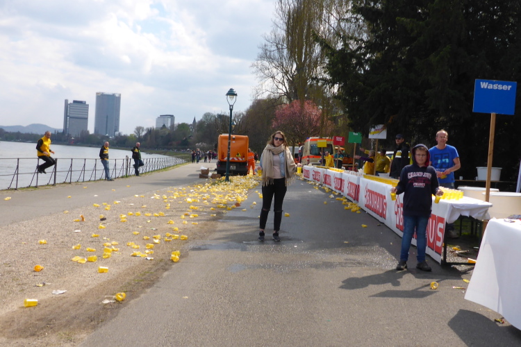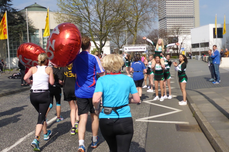 Bei km 17 kommen wir in den Bereich der Siedlung Vicus Bonnensis, des zivilen römischen Bonns. Hier lebten im 2.Jahrhundert mindestens 10.000 Menschen. Die Ausgrabungen an der Dahlmannstraße wurden vom Investor Hyndai finanziert, der hier 2006 das Kongresszentrum baute. Dieses Gebäude, wie auch die der Deutschen Welle und der Vereinten Nationen, werden nie einen Pokal gewinnen können. Die Cheerleaders, die uns auf die Spendenmatte lotsen, schon. Ob jemand weiss, wofür er mal wieder spenden soll? Es wird für einen guten Zweck sein.