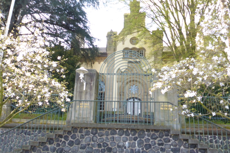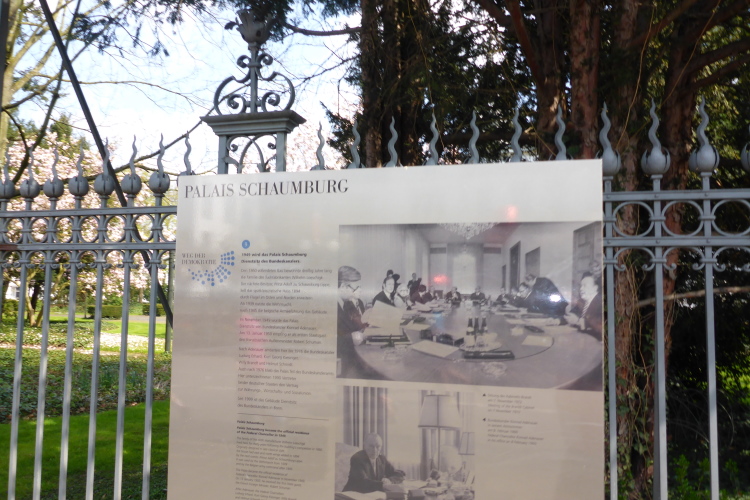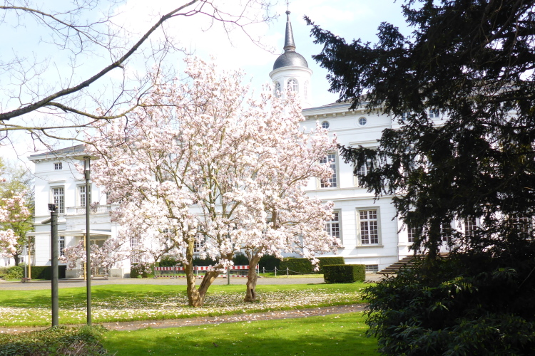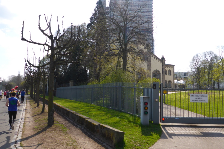 Vor dem Palais Schaumburg das zwei Meter große Denkmal für Konrad Adenauer. Das Palais ist immer noch (Zweit)-Wohnsitz der Bundeskanzlerin. Bei der Größe des Palais fällt bestimmt eine enorme Zweitwohnsitzsteuer an. Zunächst fallen jede Menge Magnolienblüten ab und ich von den 4:30 Pacern, als ich für ein Foto abbiege. Danach kommt die Villa Hammerschmidt, für die der Bundespräsident Zweitwohnsitzsteuer, oder Drittwohnsitzsteuer zahlen müsste.