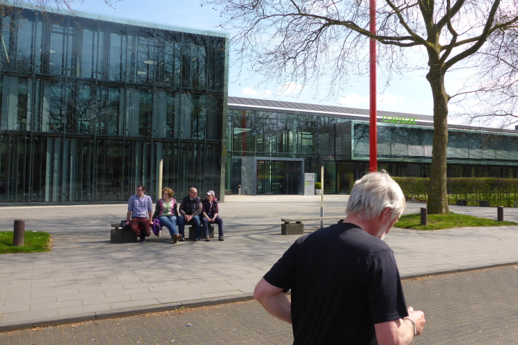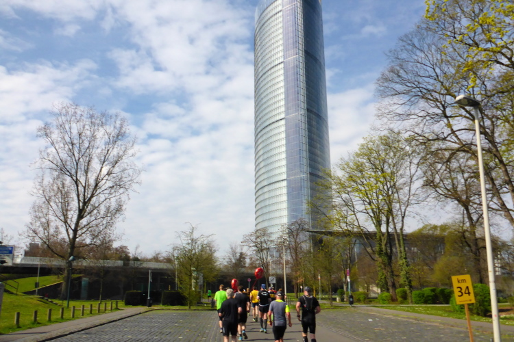 Nun kommen wir an einer anderen Großplastik vorbei, am Hochhaus des Hauptsponsors Deutsche Post DHL. In nur zwei Jahren (2000-2002) wurde das größte Hochhaus außerhalb Frankfurts gebaut, gegen den Stimmen der Oppositionspartei CDU. Das erwähne ich nur, weil es in Frankfurt immer andersrum war. Auch in 2002 war es, als die Deutsche Post die amerikanische Firma DHL übernahm. Deren Logo ist nun sichtbar, es sind die Anfangsbuchstaben der Gründer Dalsey, Hillblom und Lynn. Von diesem Hochhaus aus gab es die ersten Drohnenflüge, die Medikamente über den Rhein transportierten. Der Postbetrieb auf die Nordseeinseln soll demnächst genauso erfolgen.