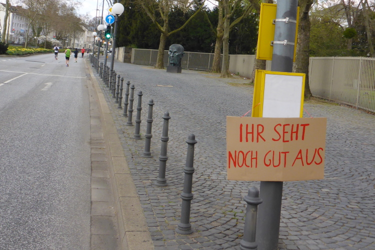 Der Wendepunkt unserer Strecke ist an der Mittelstraße. Meine Großeltern bekamen nach der Vertreibung hier eine Wohnung zugewiesen. Wenn wir jetzt weiterlaufen würden, dann wäre das die frühere Streckenführung des Marathons, die damals (also lange nach der Vertreibung) noch bis Mehlem ging. Dort kämen wir zu dem Haus, das wir nach einer Party komplett renovieren mussten. Wenn die Jugend von heute so cool wäre wie wir damals, dann gäbe es heute keine globale Erwärmung.