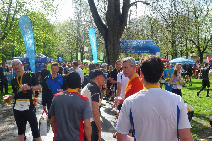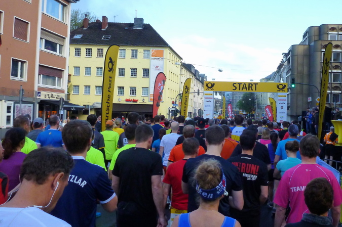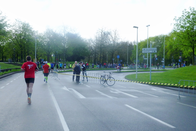 Warum schon jetzt, wenn der Marathon doch erst um 10:30 Uhr startet? Ganz einfach, nach Paris am letzten Sonntag genügt mir heute ein Halber und dank 21,1 km-Kurs hat man damit das ganze Vergnügen trotz halber Strecke. Euch entgeht also nichts und auf der Strecke ist erheblich mehr los als zwei Stunden später. Die Nachmeldung bescherte mir eine Startnummer ohne Blockeinteilung, daher reihe ich mich nach den Erfahrungen aus 2012 und 2013 (zeitlich versetzte Blockstarts) recht weit vorne ein, kontrolliert wird das nicht. Um 8:45 Uhr wird die Elite losgeschossen, wenig später der erste reguläre Block, danach der, in dem ich stehe, und der sich im Nachhinein als der richtige entpuppen sollte.