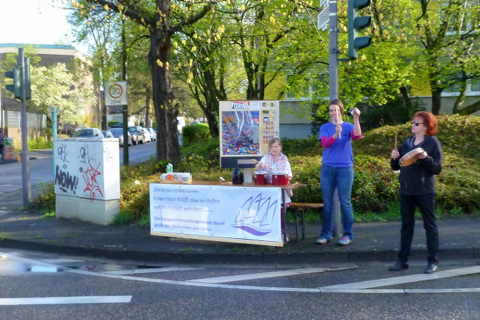 Die erneute Unterquerung der Kennedybrücke auf der Bonner Seite erlaubt einen phantastischen Blick auf die hinter uns Liegenden, die sich noch auf der Rheinüberquerung befinden. Km 10, jetzt schon am Ufer in der Rheinaue, passiere ich nach gut 52 min., was mich doch ein wenig nachdenklich macht. Ob das auch nur näherungsweise zu halten sein wird? Doch ich fühle mich wirklich überraschend frisch und locker, und schreite daher weiter munter aus. Es geht ja um nichts, falls ich einbrechen sollte. Vorbei an der Bastion sticht mir ein sehr vertrautes Bild ins Auge: Ein vermuteter Junggesellenverein macht mächtig Alarm und betreibt eine private Verpflegungsstelle mit bleihaltiger Gerstenkaltschale. Niemand in meinem Umkreis reagiert auf ihre lautstarke Animation bis auf einen Mann, der locker ihr Vater sein könnte. Aaaah!, sage ich nur, sehr lecker! Und die Buben sind glücklich.
