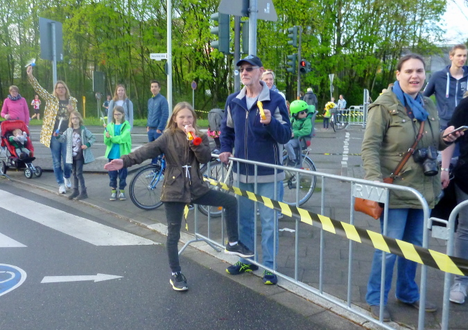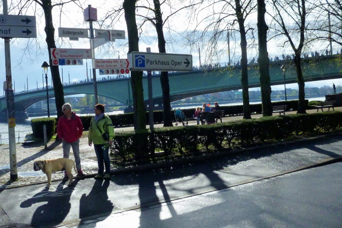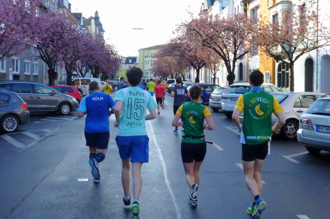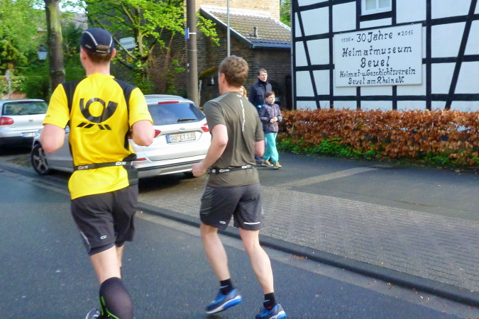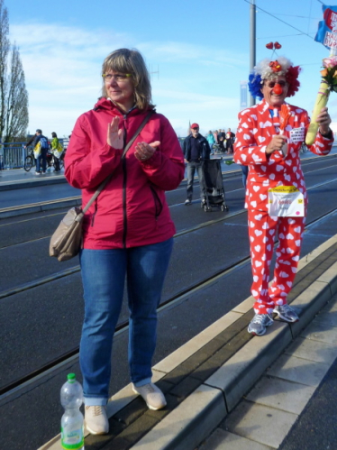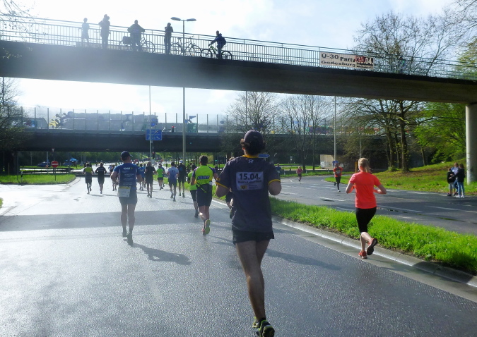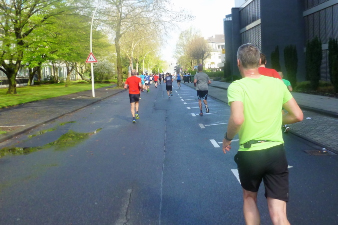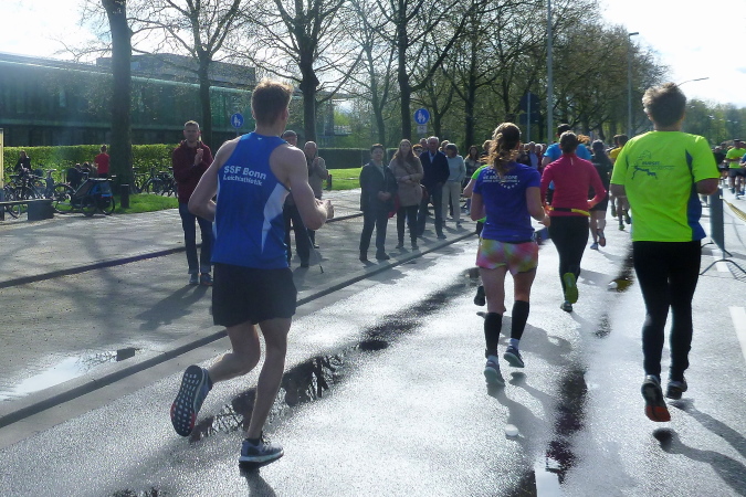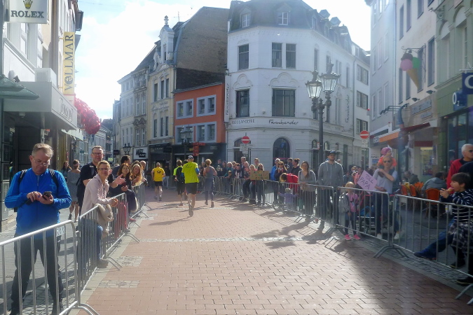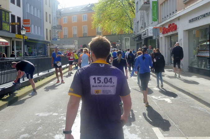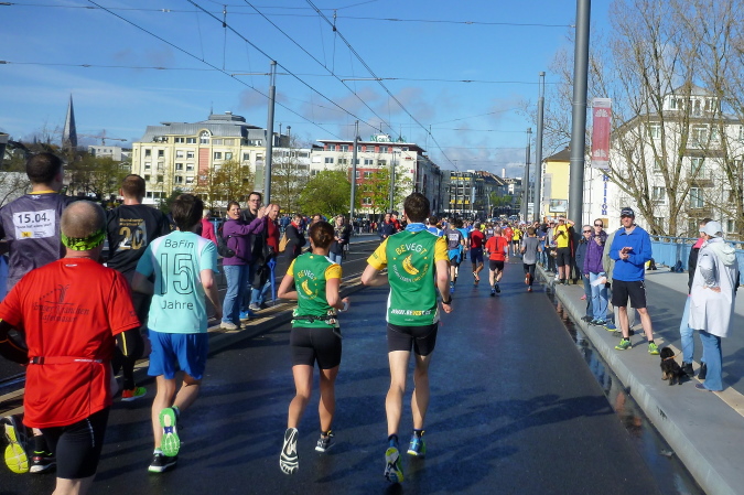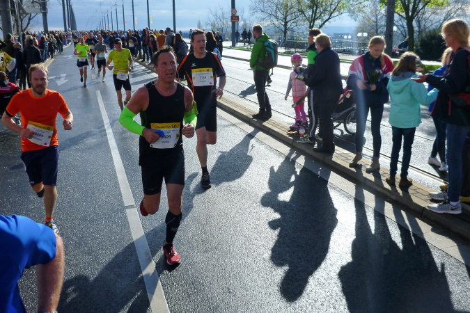 Zunächst ein paar Meter geradeaus, geht es dann nach rechts direkt auf der den Rhein überspannenden Kennedybrücke zur Beueler Seite. Auf dem rechten Randstreifen steht neben vielen anderen – nein, nicht Elke, sondern unser lieber Freund Michel Descombes. Wir begrüßen uns herzlich wie alte Bekannte. Fein ist bereits die Percussion-Band, die uns lautstark Beine macht und gut gelaunt alles bearbeitet, was Krach macht. Die Straßen in Beuel sind breit, dazu ist das Feld natürlich stark entzerrt, ich finde sogleich meinen Rhythmus. Das ist doch eine ganz andere Kiste als noch vor sieben Tagen in Paris, obwohl auch hier ein wirklich ansehnliches Feld unterwegs ist. Knapp unter zwei Stunden, das ist mein Ziel für heute. Aber als ich auf die Uhr schaue, entpuppen sich die gefühlten 5:30 bis 5:40 min/km als eine halbe Minute schneller. Das Feld zieht ganz offensichtlich und der alte Harung ist ganz tapfer dabei.