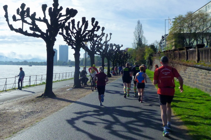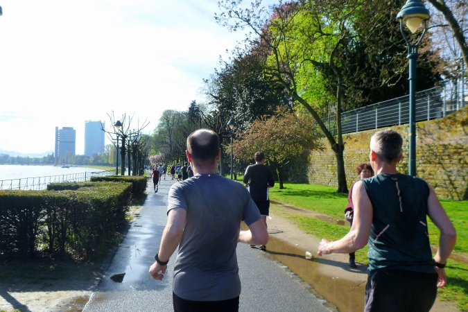 Vorbei erneut an Michel und der Sambagruppe verlassen wir Beuel nach sieben km wieder und wechseln bei bestem Wetter auf die Bonner Seite zurück. Was haben wir für einen Dusel: Bei uns hatte es die ganze Nacht teilweise wie aus Eimern gegossen und auch aus Bonn wurden morgendliche Platzregen berichtet. Im strömenden Regen angefahren und in den Shuttlebus gestiegen, setzte der Segen von oben schlagartig mit dem Verlassen des Busses aus. Kurz vor dem Start reißt die Sonne auf und sollte uns nicht mehr verlassen. Das, gepaart mit etwa 13° Lufttemperatur, lässt keinen Raum für Ausreden bei ungenügender Zielerreichung.