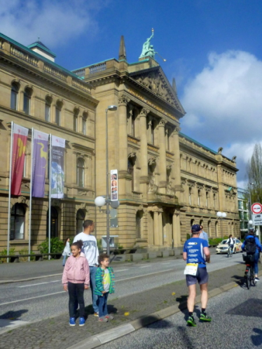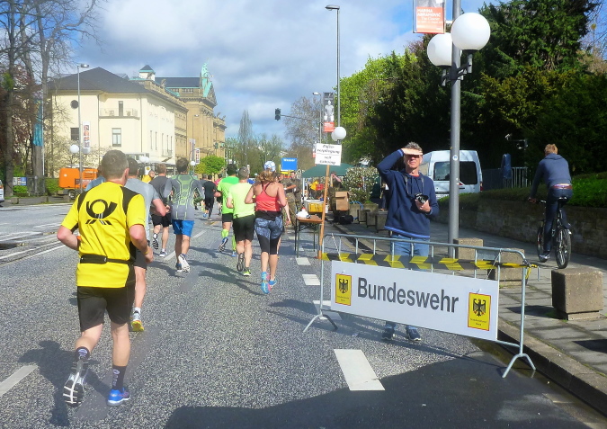 Die Villa Hammerschmidt, der Bonner Dienstsitz des Bundespräsidenten, wird passiert, ebenso mit dem Wasserwerk das ehemalige Ausweichquartier des Deutschen Bundestags während der Renovierung des damaligen Plenarsaals. Jetzt wird es selber saniert. Vorbei am Postturm, ein Dreigestirn Dudelsackbläser gibt mir den passenden Vorgeschmack auf meinen nächsten Marathon, sind als erneute Wendepunktstrecke breite Straßen abzulaufen, auf denen man sich auch bei hoher Läuferdichte nicht in die Quere kommt.