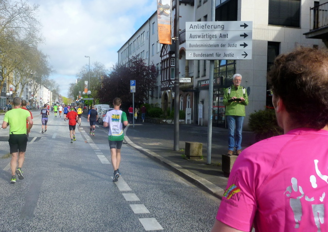 Herrlich ist der Blick voraus, rechts auf den „Langen Eugen“, das ehemalige Abgeordnetenhochhaus (nach dem eben nicht langen ersten Bundestagspräsidenten Eugen Gerstenmaier), und den Postturm, links auf das nicht nur für Läufer hochattraktive Siebengebirge. Kilometerweit kann ich die Läuferschlange zunächst von hinten nach vorne beobachten, später umgekehrt, ein imposantes Bild. Ja, das ist heute der Vorteil des Halben. Später, wenn nur noch die Marathoner unterwegs sein werden, wird es deutlich einsamer werden. Das Verhältnis der Teilnehmer beträgt etwa 1:8, 735 Marathonläufern im Ziel stehen 5.985 Halbe gegenüber. Verglichen mit den Werten von 2013 ist der Halbe stabil geblieben, die Beteiligung beim Marathon ist jedoch um ein Fünftel niedriger.