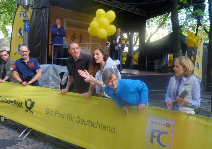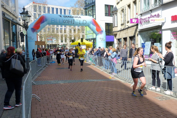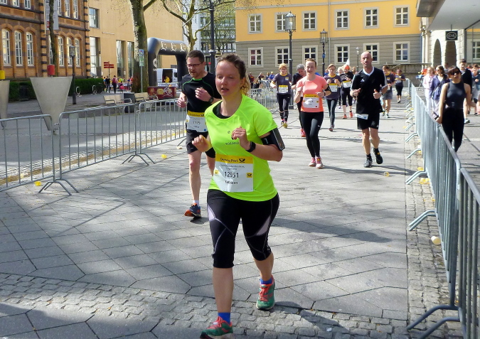 Ich jedenfalls habe mit Blick auf das Zeiteisen Blut geleckt und nehme die Beine in die Hand. Das klappt nach wie vor für einen älteren Herrn hervorragend, damit hätte ich im Leben nicht gerechnet. Je näher wir der Startaufstellung kommen, desto stärker entwickelt sich der Zuschauerzuspruch. Wir müssen allerdings noch eine kleine Runde von anderthalb km durch Stadt drehen und biegen daher links ab. Vorbei am Münster durch die zentrale Innenstadt führen die letzten paar hundert Meter vor vielen Fans, vorbei an der Replik des ehemaligen Sterntors durch die Sternstraße auf den Zielbogen vor dem historischen Rathaus zu. Der rote Teppich ist hier angesichts des Hauptsponsors und Namensgebers ein gelber, sehr nett anzuschauen, und schon ist es geschafft. Ich fühle mich wirklich locker, nicht im Ansatz am Ende und bin doch noch unter 1:50 Std. geblieben. Zufriedenheit macht sich breit.