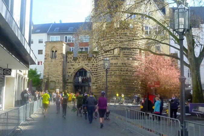 Ich flitze zur Abfahrt Auerberg von der A 565, wo ich unter der Brücke parke und mich vom Shuttlebus zum Ort des Geschehens bringen lasse. Ein hervorragender Service, fast wie beim Besuch der Heimspiele des 1. FC Kaiserslautern, aber das ist ein anderes Thema. Leider kein gutes. Meinen Kleidersack werde ich im Zelt am Belderberg /Stadtgarten los und schlängele mich durch die erwartungsfrohe bunte Läuferschar hinter dem attraktiven Koblenzer Tor in den Startblock. Der zweigeschossige barocke Torbau ist Teil des ehemaligen (Kölner) kurfürstlichen Schlosses. Um 8:30 Uhr stehe ich parat, nachdem ich zahlreiche liebe Bekannte begrüßen konnte.
