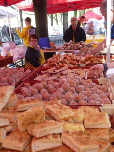 Nach der Medaillenübergabe geht’s zur Zielverpflegung. Die ist nicht gut, nicht hervorragend, sondern einfach konkurrenzlos superspitzesensationell! Ehrlich, hier hat absolut niemand die Chance, mit negativer Kalorienbilanz nach Hause zu fahren. Im „REWE-Dorf“ gibt’s Kalorien bis zum Abwinken (und auf der Homepage sogar eine Speisekarte!). Fruchtiges (Melonen, Äpfel, Bananen), Süßes (Quarkbällchen, div. Blechkuchen, Snickers, Mars, Bounty, Twix, Corny, Riegel), Salziges (Laugenstangen, Schmalzbrote, Frischkäsebrote), Herzhaftes (Fleischwurst, Flönz [für Ausländer: Blutwurst], Remouladeneier, Gouda, Gürkchen), Grillspezialitäten (Bonn Marathon Wurst, Bonn Marathon Frikadelle), Getränke (Tee, Kaffee, Fleischbrühe, Coca Cola, Bonaqa Apfelsaft, Dextro Energy, Kölsch, Erdinger Alkoholfrei). Wie gesagt, es ist der Hammer! Hoffentlich lässt die gefräßige Meute noch etwas für diejenigen übrig, die sich über die doppelte Distanz wirklich anstrengen müssen.