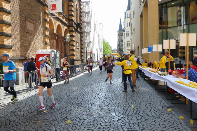 6 Verpflegungsstände und zusätzliche 2 Wasserstellen an der Strecke auf jeder Halbmarathonrunde. Es gibt Wasser, Tee, Cola, Isogetränk und Bananen als feste Nahrung. Im REWE-Verpflegungsdorf für die Finisher grandiose, unvergleichlich gute Zielverpflegung.