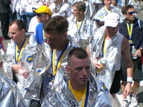 Ich erreiche die lange Schlussgerade der Bolyston Street. Mehrreihig säumen die Menschen die Straße und treiben die Läufer lärmend zum Schlussspurt an. Was für ein Finale! Ein Blick auf die Uhr mobilisiert meine noch vorhandenen Restenergien. Zumindest unter 3:30 zu bleiben ist mein Ziel. In der Ferne erblicke ich den mächtigen blauen Bogen des Zieleinlauftores. Den Blick davon nicht mehr abwendend scheinen alle Anstrengungen auf einmal verflogen. Schon bald höre ich die dauerquasselnde Lautsprecherstimme des Einlaufkommentators. Die letzten paar hundert Meter tauche ich ein in ein wahres Zuschauermeer. Die dichten Menschentrauben lassen zwischen Häusern und Laufstrecke keinen Platz mehr, kurz vor dem Ziel türmen sie sich zudem auf mobilen Tribünen. Dann geht alles ganz schnell: Vorbei an einer Stafette wehender Fahnen, über die roten Matten der Zeitmessgeräte und die breite blaue Bodenmarkierung mit dem Wort „Finish“ hinweg – und es ist geschafft. Ein herrliches Gefühl.