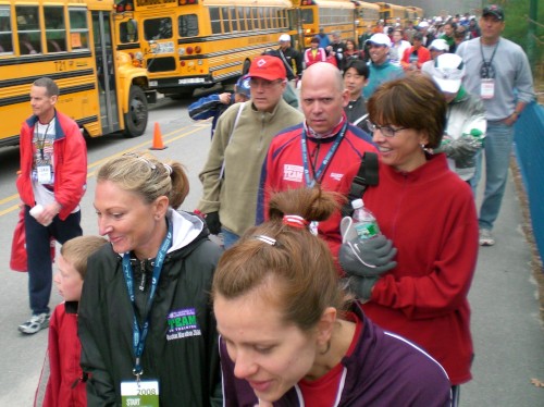Um 9.15 Uhr hält mich allerdings nichts mehr im “Village”. Einen knappen Kilometer muss ich von hier aus schnurgerade über die Grove Street, eine schmale Wohnstraße, durch Hopkinton marschieren, ehe ich das eigentliche Startgelände erreiche. Gleich am Anfang dieser Straße erwartet mich zunächst das schon vertraute Bild zahloser hintereinander parkender Schulbusse, die dieses Mal allerdings zum Zwecke der Gepäckabgabe bereit stehen. Je näher ich mich dem Startgelände nähere, desto dichter wird der Trubel und größer wird die Hektik.