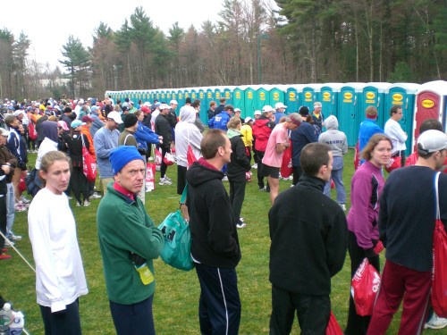 Schon kurz vor 5 Uhr am Marathon-Montag klingelt der Wecker- fünf Stunden vor dem offiziellen Marathonstart. Ein Stündlein lasse ich mir Zeit für all die kleinen Dinge, die vor einem solchen Ereignis so anfallen. Punkt 6 Uhr steht der Shuttle-Bus vor dem Hotel, der uns ins Stadtzentrum zur Tremont Street bringt, von wo aus die zentrale Verladung der Teilnehmer zum Start in Hopkinton erfolgt. Auch dieses Unterfangen ist ein Musterbeispiel für die ausgereifte Organisation der Veranstaltung. Denn es gilt, von 6 bis 7.30 Uhr, also innerhalb von nur 1 1/2 Stunden, zwischen 20.000 und 25.000 Menschen in Schulbusse zu verfrachten. Hochgerechnet bedarf es dafür zwischen 400 und 500 Bussen und so wundere ich mich nicht, dass in den Nebenstraßen bereits eine gewaltige Armada jener charakteristischen gelben altertümlichen Busse in Wartestellung steht. Jeweils etwa 20 dieser Busse reihen sich in der Tremont Street hintereinander am Straßenrand auf. Vor jedem Bus bildet sich eine lange Schlange, die schon bald weit in den angrenzenden Stadtpark hineinreicht. Das funktioniert ohne jedes Chaos. Das weitere Prozedere läuft so, dass alle in der Reihe jeweils wartenden Busse gleichzeitig bis auf den letzten Platz besetzt werden und dann gleichzeitig im Konvoi losfahren. Es rücken sodann sofort die nächsten 20 leeren Busse nach und die nächste Besetzungsrunde läuft. Ich bin überrascht, wie schnell ich einen Platz in einem Bus finde und kurz darauf über die Highways aus der Stadt hinaus brause. Stets haben wir Vorfahrt - dafür sorgt schon die State Police, die sich mit Blinklicht an neuralgischen Punkten, etwa den Mautstellen des Highways, postiert hat. Etwa eine Dreiviertelstunde sind wir unterwegs durch den trüben kalten Morgen, genug Zeit, um mir wieder einmal bewusst zu machen, dass 42 km ganz schön weit sind und die Vorstellung, all das, was wir jetzt hinaus fahren, - wenn auch auf einer anderen Strecke - zurück laufen zu müssen, vermittelt mir schon ein etwas mulmiges Gefühl. Vom Highway geht es schließlich über kleine, kurvige Sträßchen durch Wälder bis ins einsam verschlafene Dorf Hopkinton mit seinen hübschen Holzhäuschen und akkuraten Vorgärten. Unser Ziel ist das weite Gelände der Middle School am Ortsrand von Hopkinton, wo traditionell das “Athletes Village” errichtet ist.