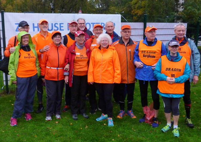 Hier ist riesig viel Platz für die Umkleiden, Startnummernausgabe und das geile Frühstücks- und Kuchenbuffet vorhanden, ein idealer Platz also zum sich Wohlfühlen. Ganz besonders freue ich mich, neben zahlreichen lieben Lauffreunden unseren Mitautoren Werner Kerkenbusch mitsamt seiner Inge und seinem VfL Bergheide wieder einmal zu treffen. Werner wohnt nur wenige Minuten entfernt, unsere heutige Strecke gehört zu seinem regelmäßigen Laufrevier. Er wird heute die 10 km unter die Füße nehmen, macht sich aber leider als Schreiberling bei M4Y etwas rar. Logisch ist man mit mittlerweile 70 Lenzen nicht mehr so schnell wie früher, aber für ein Finish innerhalb des normalen Zeitlimits reicht es doch noch immer. Gerne würden wir wieder mehr von Dir lesen, Werner! Die Bergmannskapelle spielt das immer wieder (zumindest von mir) gerne gehörte Steigerlied, untermalt von diesen Klängen treten wir beherzt die Flucht nach vorne an.