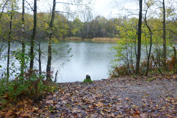Bei km 12 kommen wir über den nördlichsten Punkt der Strecke, an der die zweite DRK-Station steht, zum idyllischen, durch den Abbau von Quarzsanden entstandenen Heidhofsee. Der ist mit 4,8 Hektar der zweitgrößte der Stadt und bildet seit 1973 zusammen mit dem sechs km später folgenden Heidesee ein Naherholungsgebiet. Dieses wird teils touristisch, teils zum Angeln genutzt, ein weiterer Teil steht als Biotop unter Naturschutz. Davon überzeugen wir uns an seiner Ostseite und haben hinter dem Denkmal des Heidedichters Hermann Löns bei einem sehr schönen Spielplatz, der ein beredtes Zeugnis von der Beliebtheit dieses Naherholungsgebietes ablegt, gut die Hälfte der Runde gepackt. Zur Belohnung werden wir am Waldkompetenzzentrum Heidhof das dritte Mal versorgt. Unsere Kompetenz liegt eher im Ausdauerbereich, daher halten wir uns trotz der netten Aufforderung („Nur einer wird Sieger sein, kehre hier gemütlich ein“) nicht lange auf. Also: „Nich lang schnacken, Kopp in Nacken!“, daher schnell weiter.