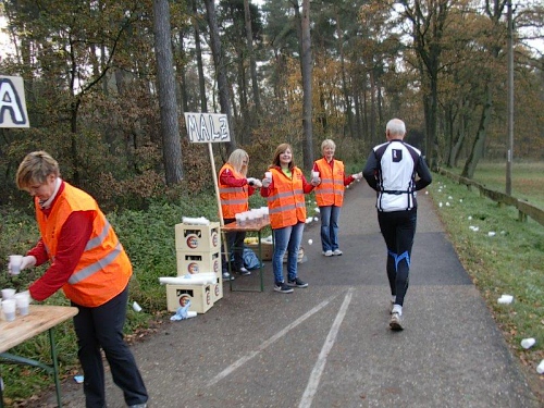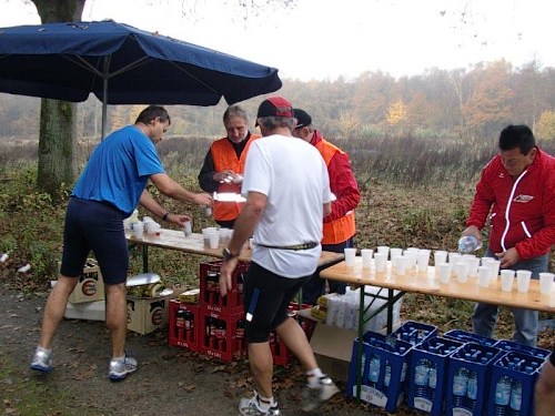 Nun kommt erst einmal eine leichte Gefällstrecke die uns zurückführt. Nochmals geht es über den Schwarzbach, der sich hier durch die Bergsenkungen zu einem kleinen Sumpfgebiet gestaut hat. Mit einigen Schlenkern dringen wir immer tiefer in den Wald mit seinen Nadel- und Laubbäumen ein. Wieder kommen wir zu einer gut bestückten Verpflegungsstelle und werden von freundlichen jungen Damen mit Beifall begrüßt. Wasser, Tee, Cola, Dunkelbier und Bananen sind im Angebot.
