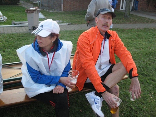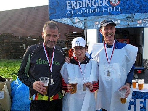 Hier im Zielbereich gibt es nochmals eine gute Verpflegung und jetzt kommt noch alkoholfreies Bier hinzu. Wer will, kann auch den Massagedienst in Anspruch nehmen. Hartmann ist auch schon längst im Ziel und konnte die zweite Runde sogar 10 Minuten schneller laufen als die erste. Auch er ist von der schönen Strecke begeistert.