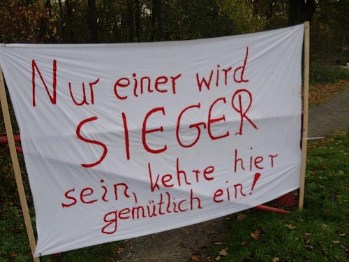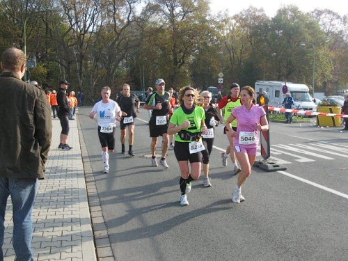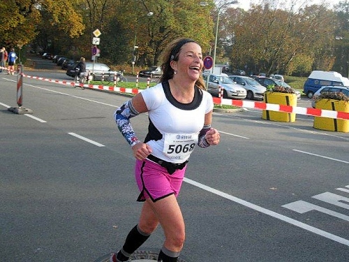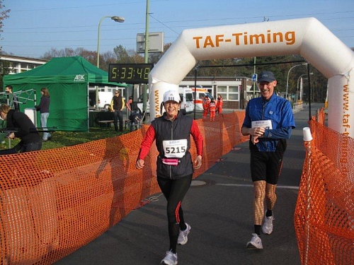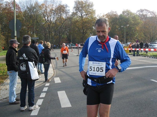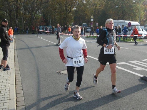 Hier hat sich eine besonders lustige Verpflegungsbetreuung aufgebaut. Auf großen Transparenten werden wir zum Verweilen aufgefordert. „Nur einer kann der Sieger sein, drum kehre hier in Ruhe ein“ lese ich. Aber auch: „ Nicht lange Schnacken, Kopf in den Nacken“. Die Anfeuerungsrufe und der Beifall an den Verpflegungsstellen tun gut, denn ansonsten gibt es keine Zuschauer an der Strecke. Jetzt sind vor allem Bananenstücke und Cola gefragt. Wieder geht es über den Schwarzbach und eine Markierung auf dem Boden zeigt uns, dass wir die Marathonmarke erreicht haben. Seit 10 Jahren bin ich nicht mehr weiter gelaufen.