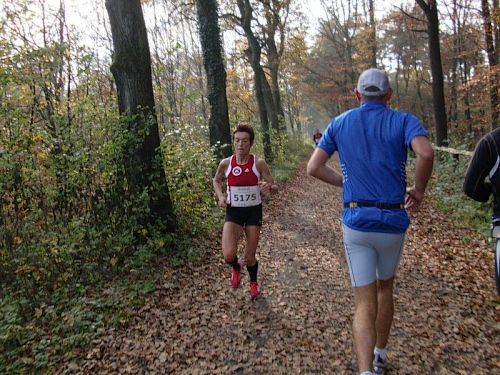 Jetzt wissen wir was uns erwartet und wir versorgen uns nochmals gründlich bei der Verpflegungsstelle. Ich laufe immer noch mit Lara zusammen und wir beschließen, auch in der zweiten Runde zusammen zu bleiben. Im Wald kommen uns die 25 km Läufer entgegen. Sie sind auf der Zielgeraden und zollen uns vielfach Beifall und Respekt, dass wir die Runde nochmals unter die Füße nehmen wollen. Unter ihnen befinden sich auch meine Vereinsfreunde Reinhard und Bernd. Bernd wird heute wieder seine Altersklasse 75 gewinnen. Einfach Klasse der Bursche.