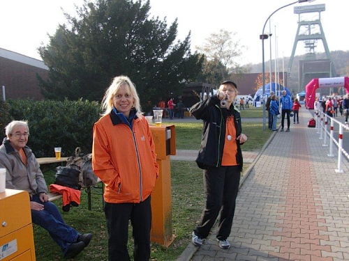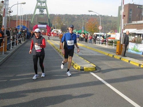 Wir nutzen wieder die nächste Verpflegungsstelle und nachdem wir den Rotbach überquert haben, geht es erneut zum Alten Postweg. Beim Abzweig zum Bergwerk, kommen uns dann die Mitläufer auf ihrer zweiten Runde bereits entgegen. Am Förderturm stehen auch unsere Fans, die uns anfeuern und der Streckensprecher wünscht uns viel Glück für die zweite Runde. Mit 2:39 bin ich bis hierher ganz zufrieden.