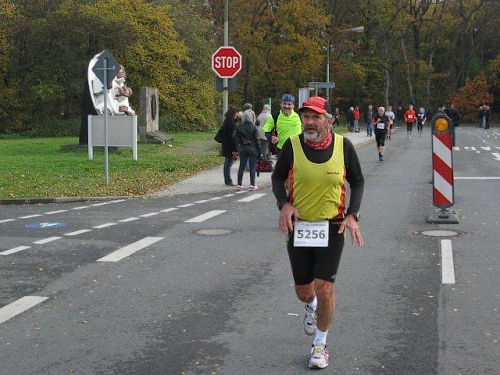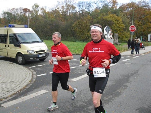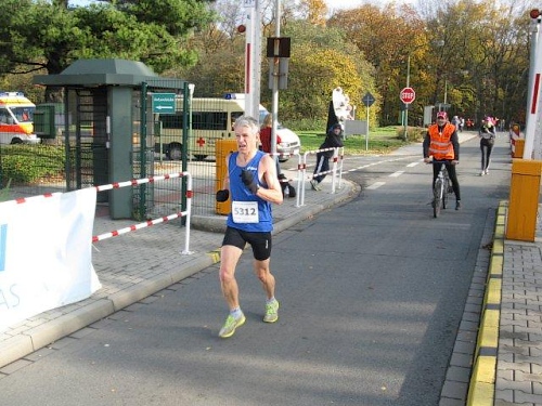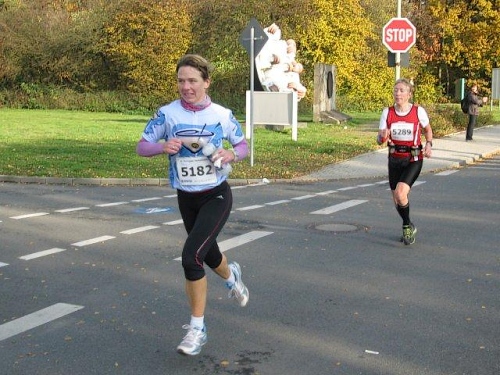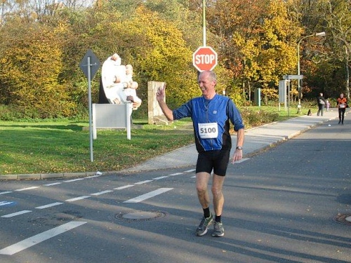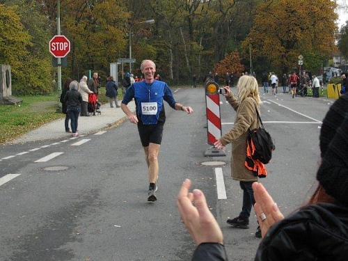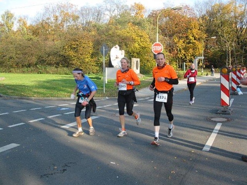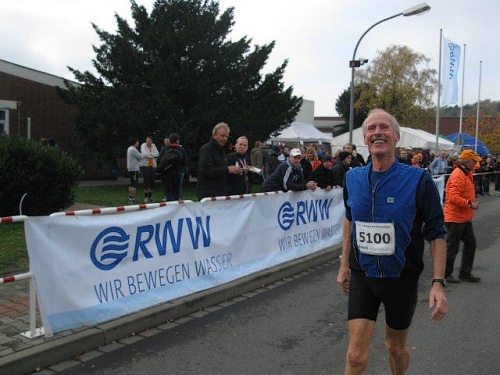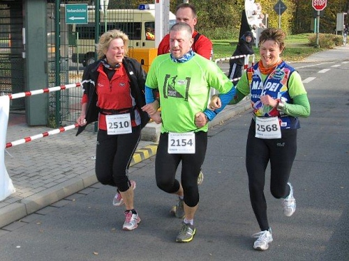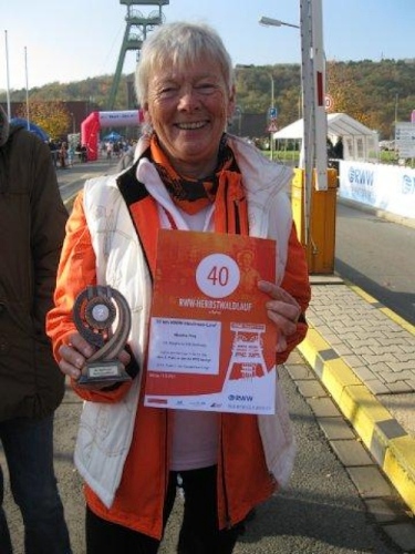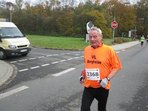 Inge und Christiane stehen im Bergheideblock, welcher alle Läufer unterstützt. Zuschauer gibt es nur hier und der Streckensprecher nennt die Namen und Vereine. Meine Uhr zeigt 2:36, kein Problem bei einer Sollzeit von 6:30. Die Strecke kenne ich ja bestens und ich kann mich am schönen Herbstwald erfreuen. Jetzt kommen mir die restlichen Läufer entgegen und Bernd ist auch dabei. Er hat sich für die 25 km Runde entschieden und wird hier in seiner Altersklasse M75 Platz 1 belegen.