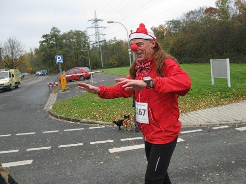 Der schön gefärbte Herbstwald bietet eine tolle Kulisse für unseren Lauf und das Laub raschelt unter unseren Füßen. Mit einer langen Geraden laufen wir nun auf den Heidesee zu. Dieser ist mit 54 Hektar noch um einiges größer als der Heidhofsee. Ein Weg mit einer Brücke zerschneidet den See in zwei Teile. Wir aber laufen am Ufer fast ganz um den See herum. 2,5 Kilometer beträgt die Runde um den See, welche auch bei den Spaziergänger sehr beliebt ist. Da die Wege breit genug sind, gibt es genügend Platz für uns Läufer. Ein Läufer erinnert uns mit einer Clownsnase daran, dass heute auch der Hoppediz erwacht. Aber Bottrop liegt in Westfalen und nicht im Rheinland, so ist er heute hier ziemlich allein.